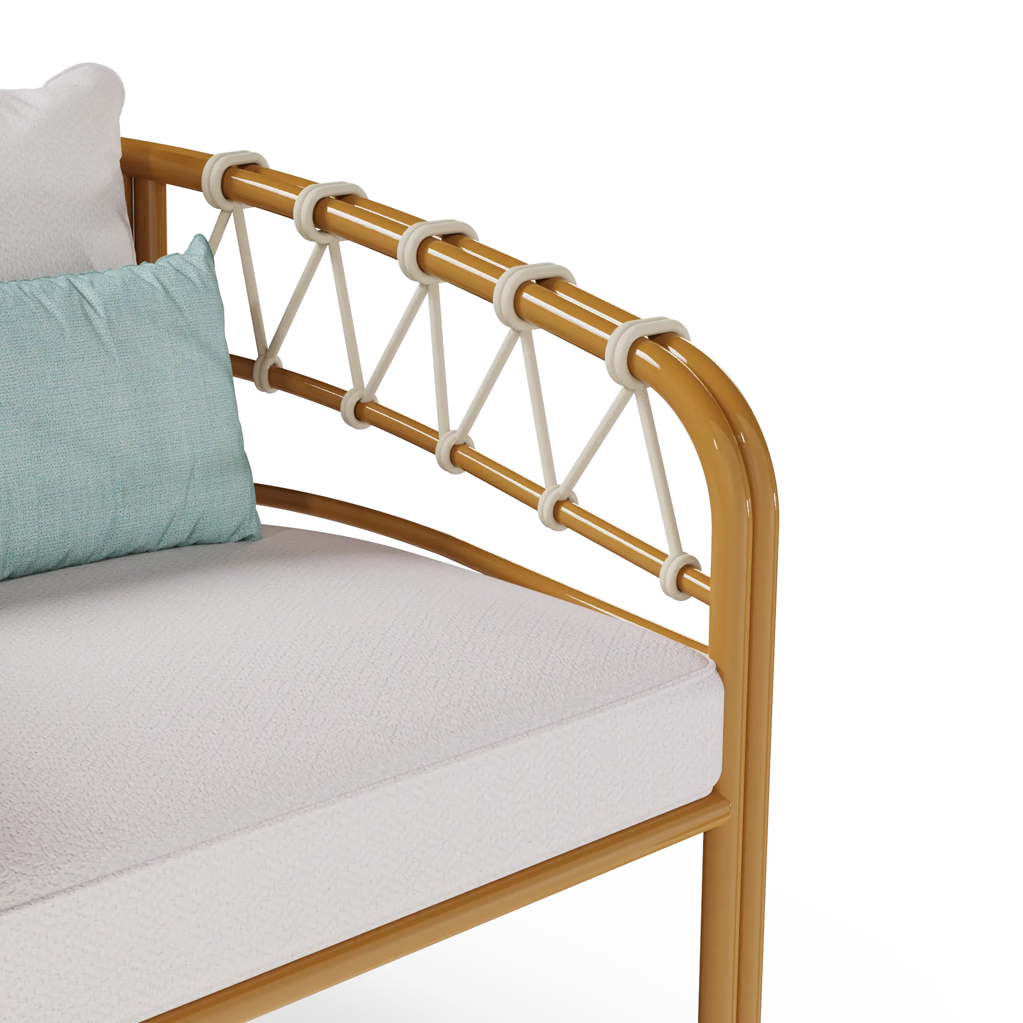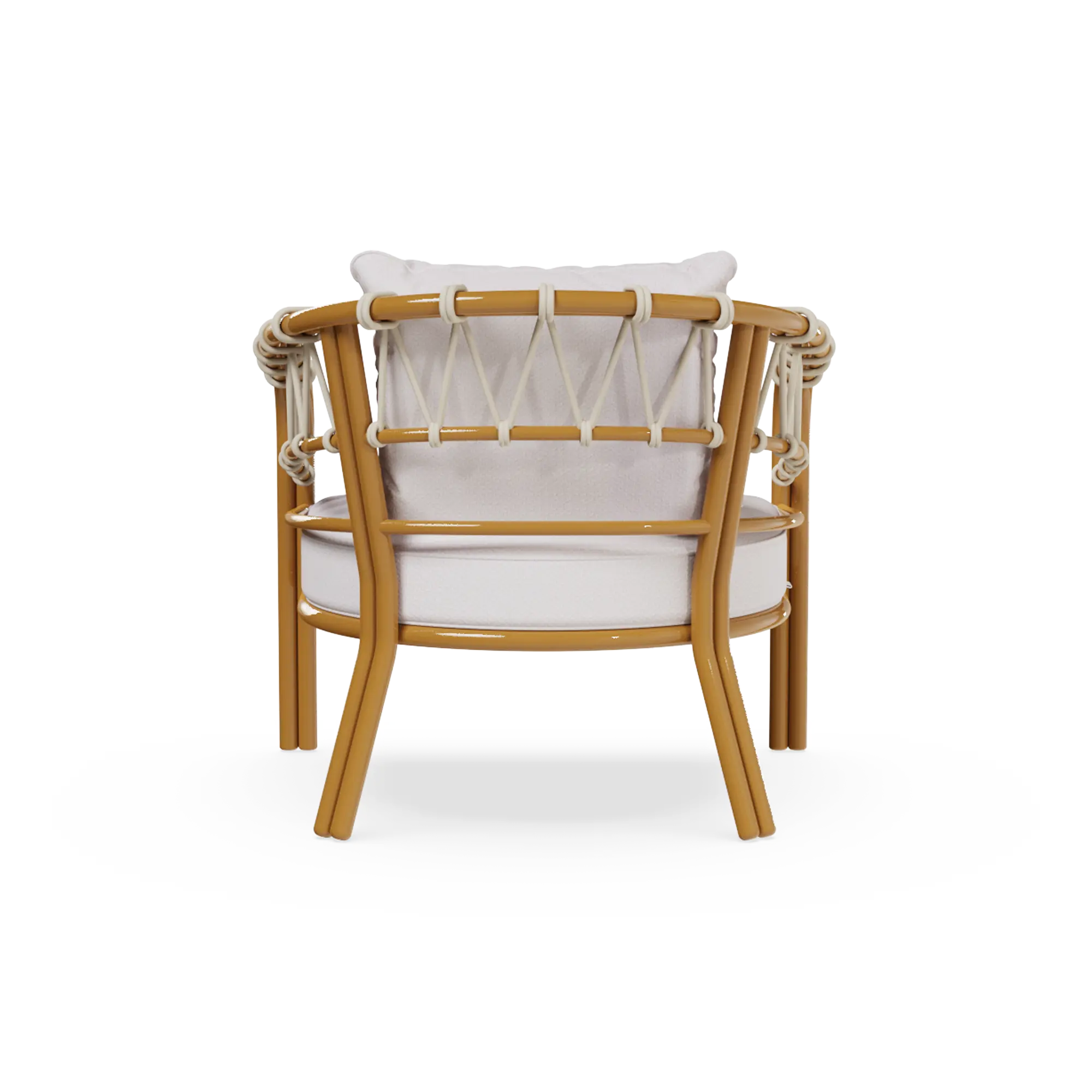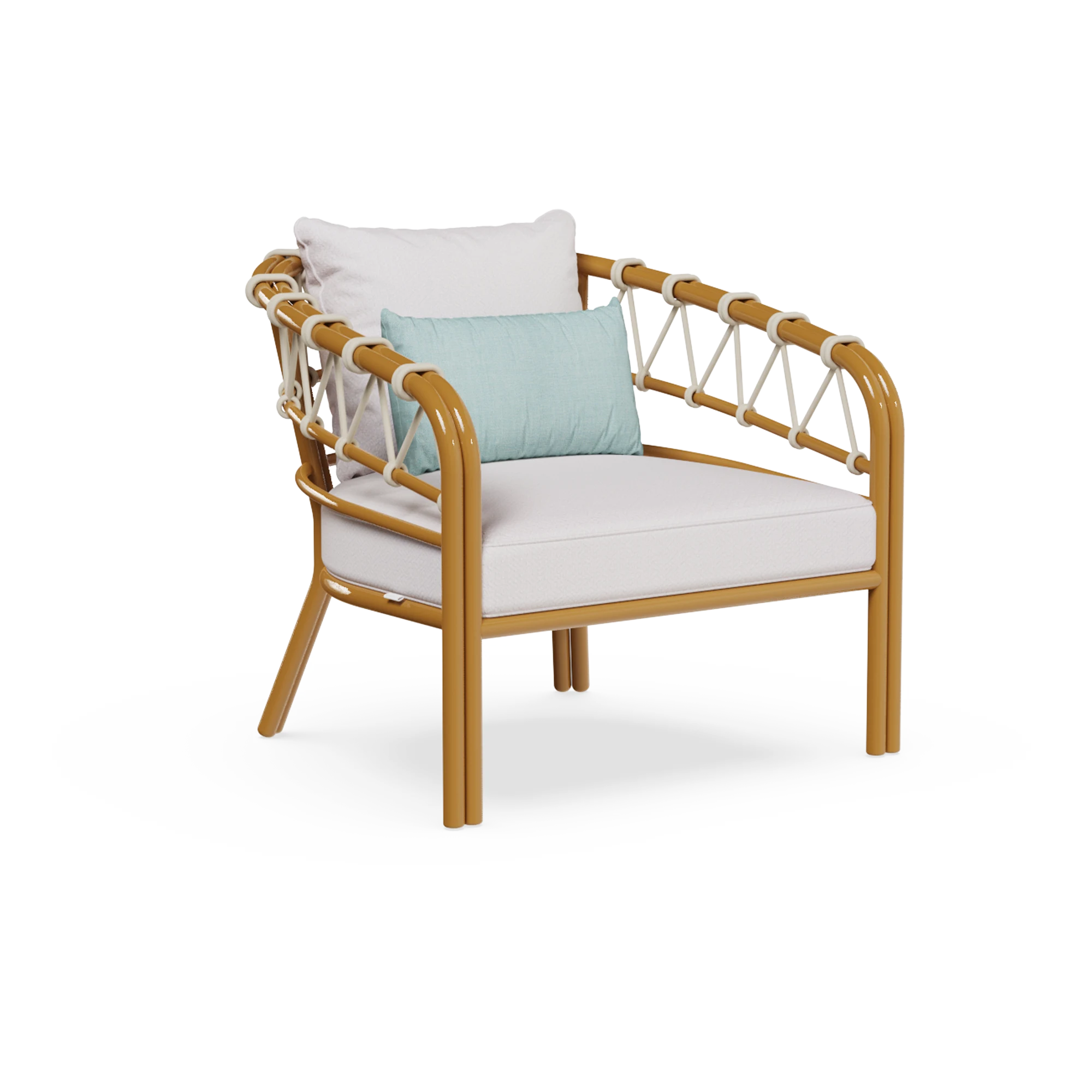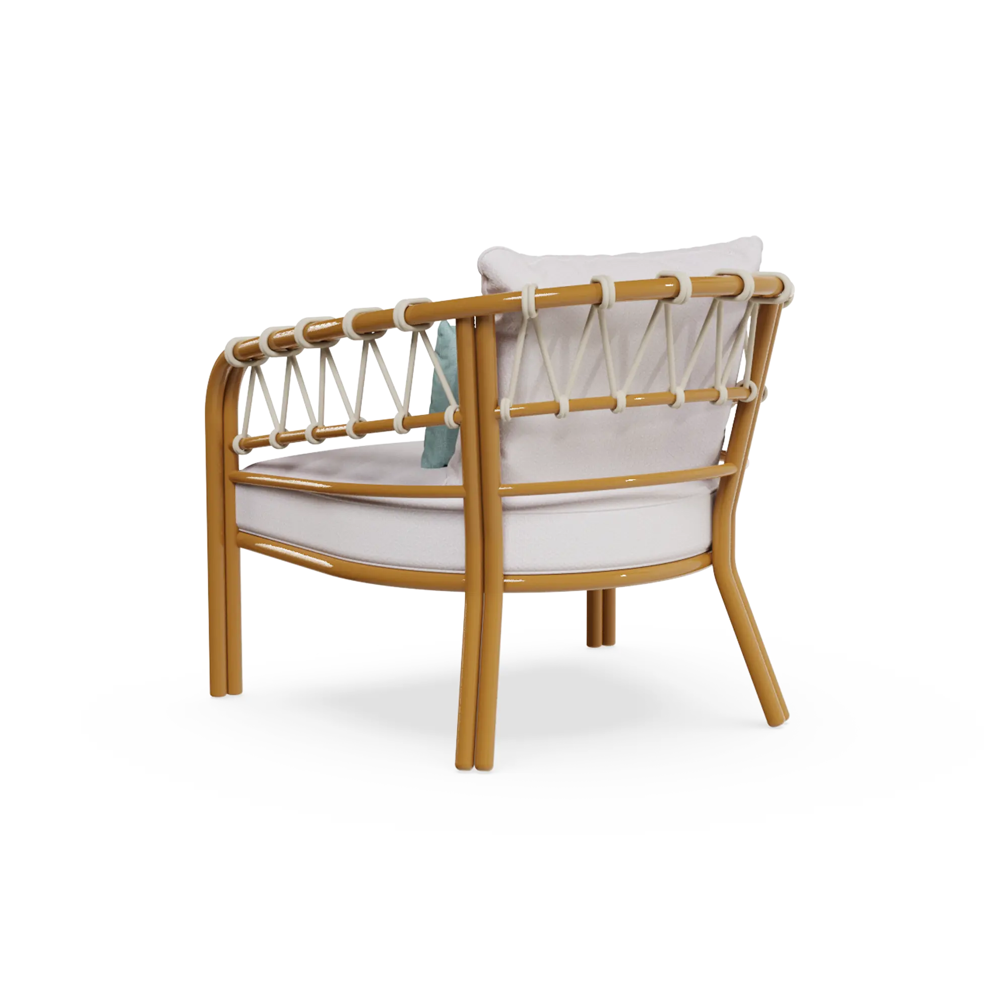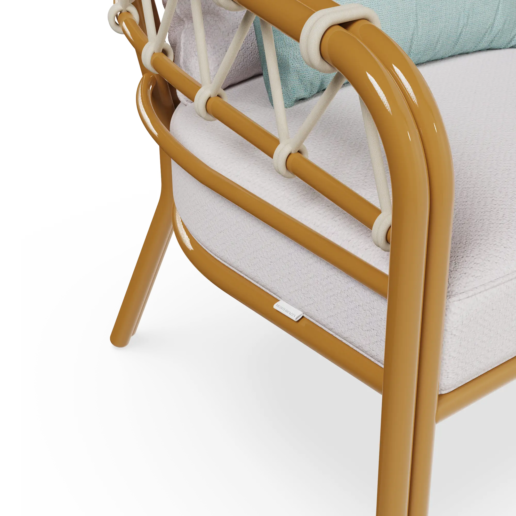 The Cefalù Armchair embodies Mediterranean elegance with its sculptural curves and refined craftsmanship. Designed in a durable lacquered metal finish and accented with hand-woven synthetic cord, it offers both resilience and style, making it ideal for year-round outdoor living. The generously cushioned seat and backrest provide exceptional comfort.