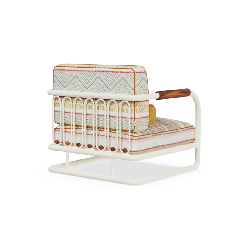 The Luna Armchair by Mediterrazza embodies the essence of outdoor luxury furniture, handcrafted in rich iroko wood with sculptural arms inspired by the curves of a Mediterranean sunset. Its back is wrapped in durable synthetic leather, while the plush seat and back cushions, dressed in an elegant striped fabric, ensure lasting comfort and refined style. Perfect for terraces, gardens, and poolside retreats, Luna blends artisanal craftsmanship with Mediterranean sophistication.