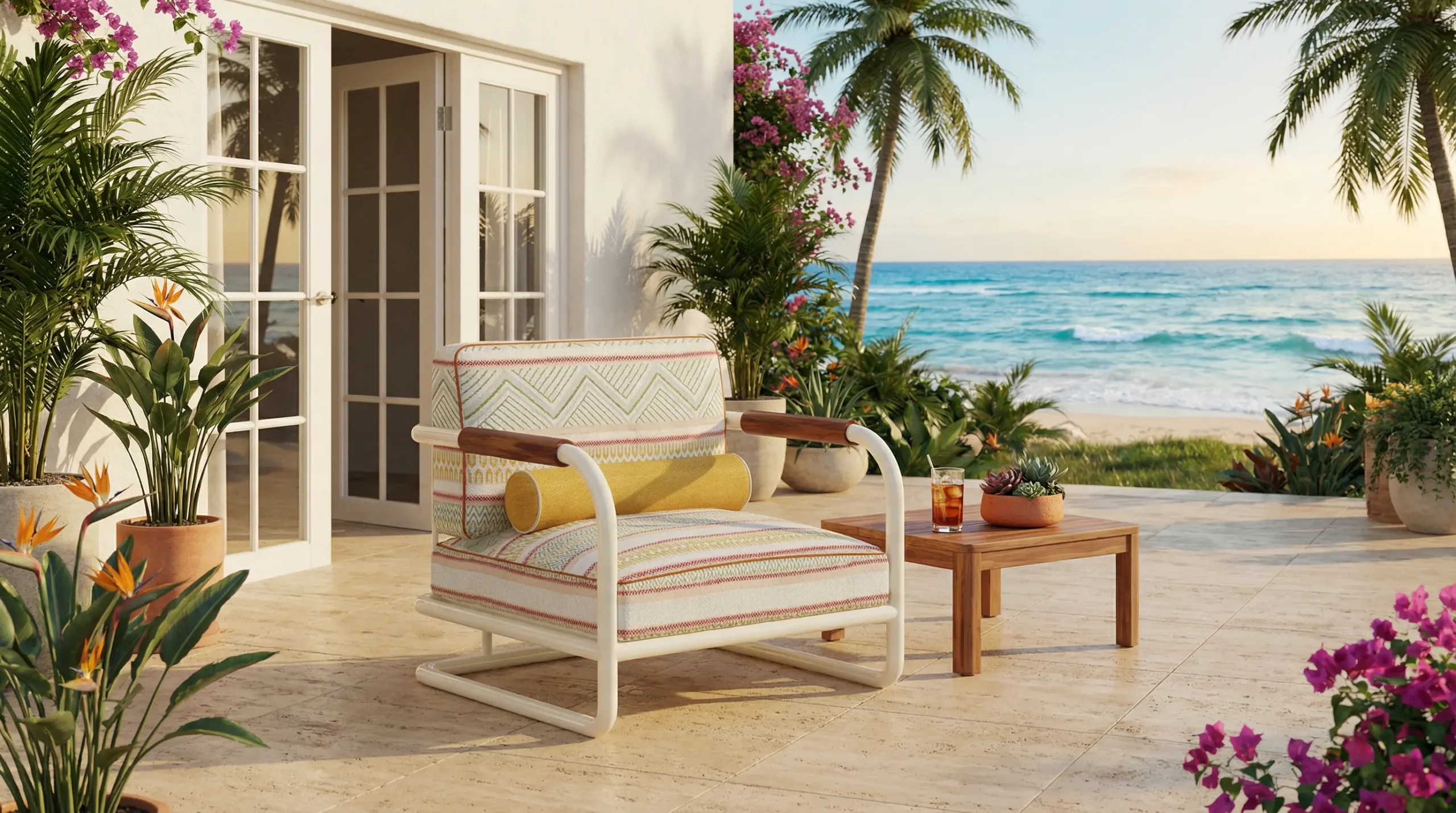 The Manarola Armchair is a vibrant expression of Mediterranean design, combining bold aesthetics with timeless comfort. Built with a lacquered metal frame designed for durability in outdoor settings, it features refined iroko wood details that add warmth and sophistication. Upholstered in colorful patterned fabric, the cushions are finished with delicate piping, showcasing meticulous craftsmanship and attention to detail.