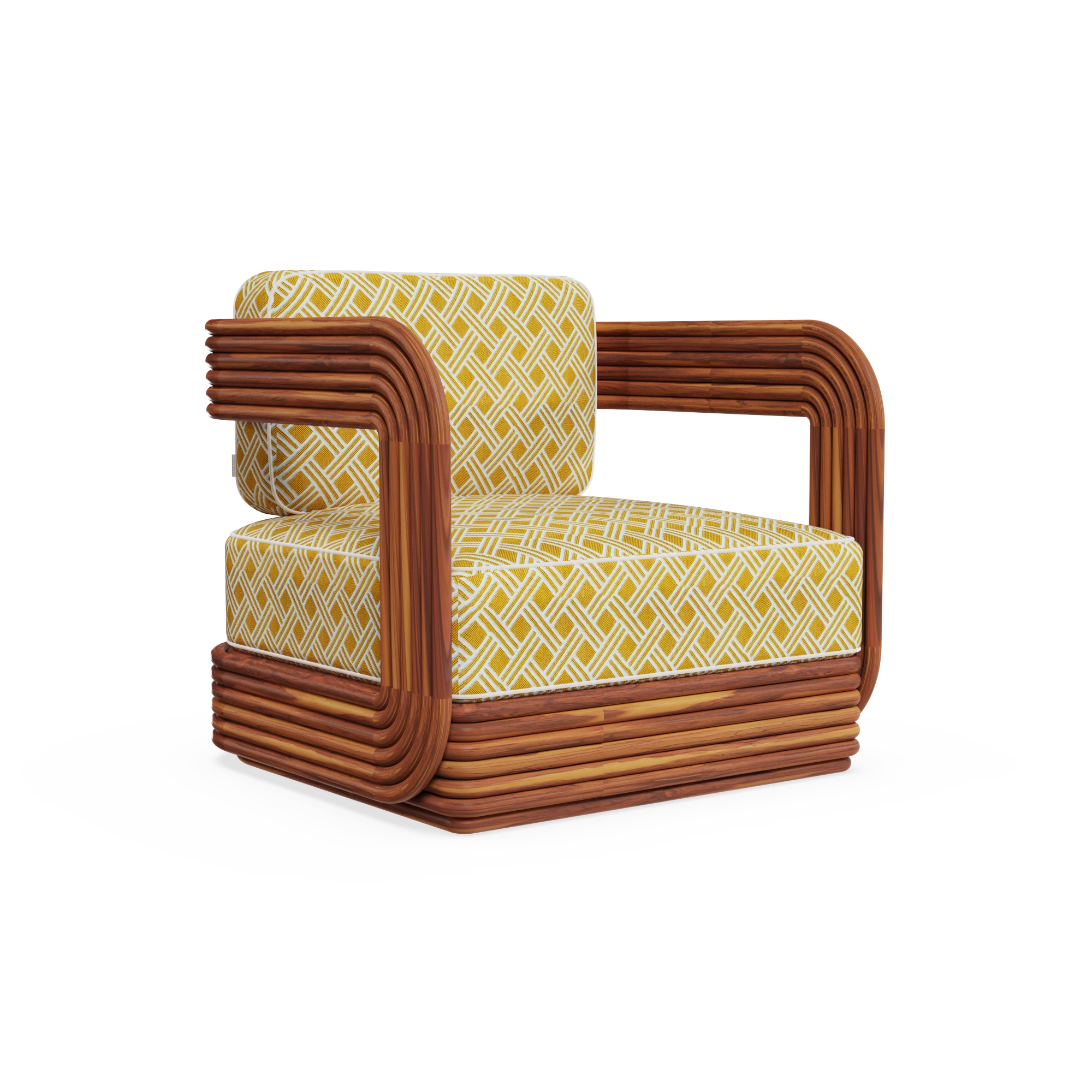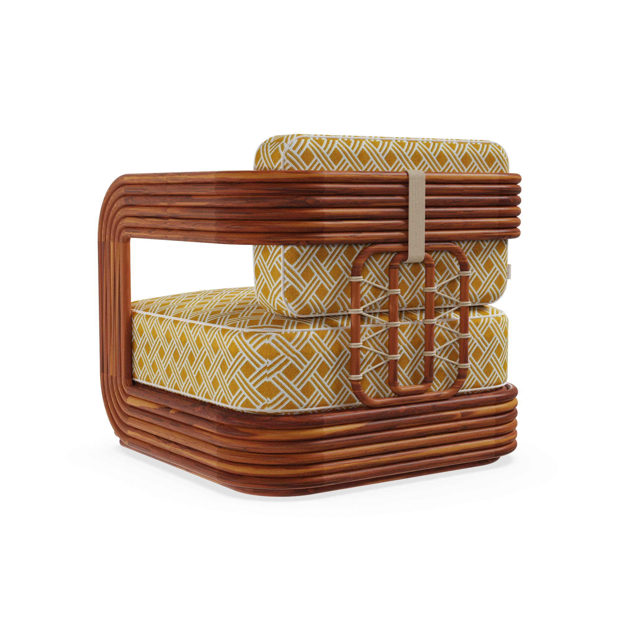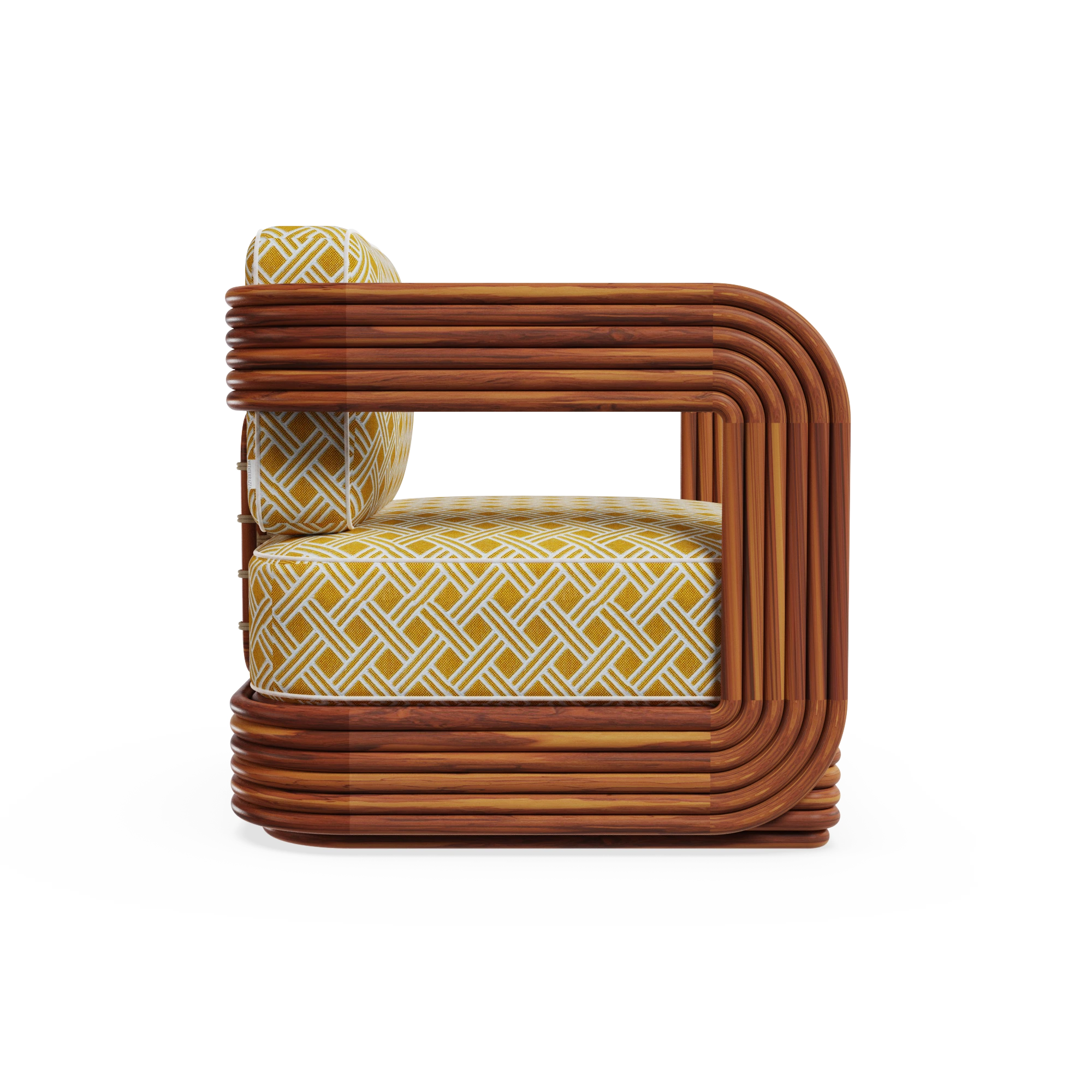 The Oia Armchair is a statement piece of outdoor luxury furniture, handcrafted in durable iroko wood to withstand outdoor living. Its sculptural ribbed base adds a distinctive bohemian touch, while the cord detail at the back reflects authentic Mediterranean craftsmanship. Upholstered in Mediterranean-inspired patterned fabric, the cushions are designed with generous proportions and piped detailing to ensure both comfort and elegance.