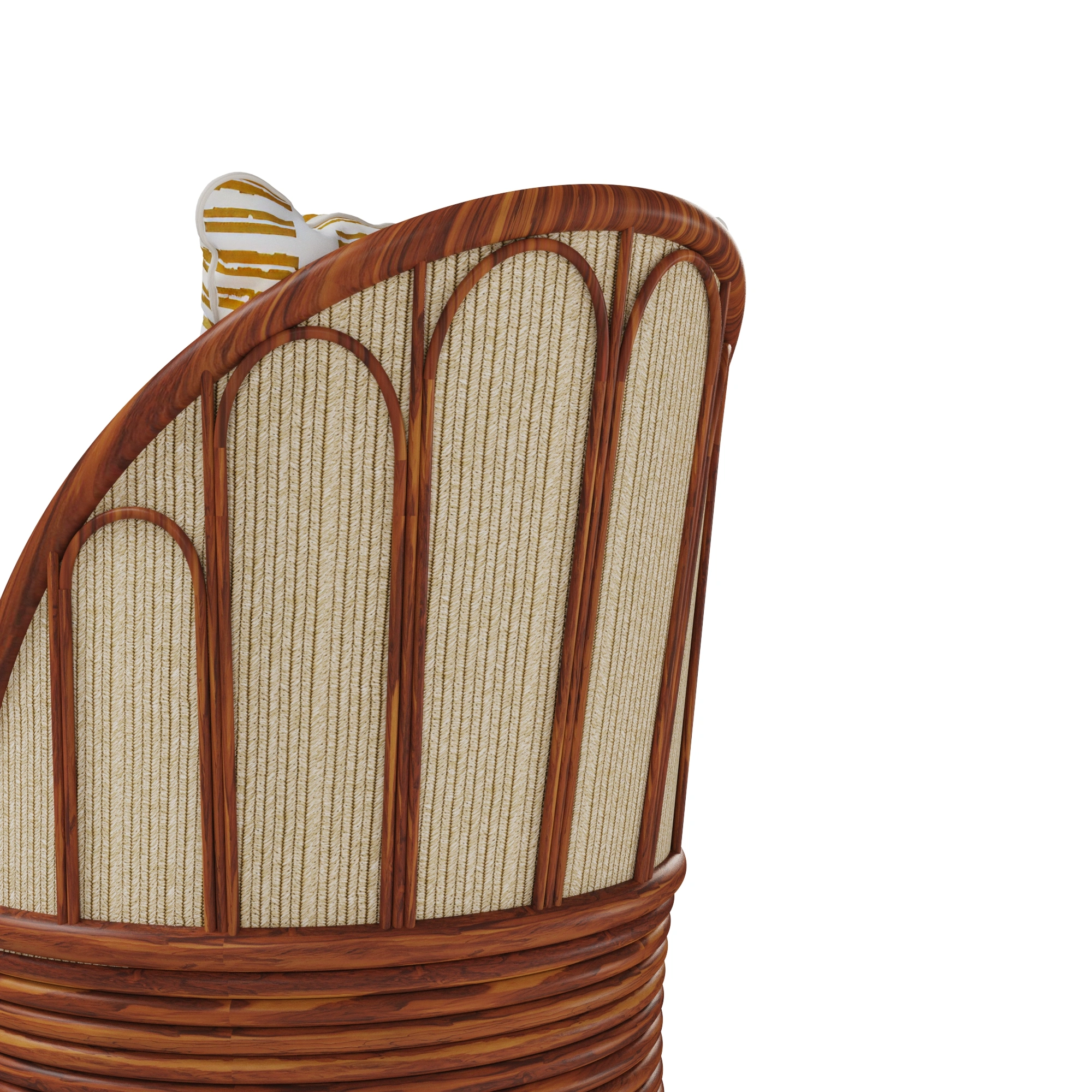 The Smeralda Armchair embodies Mediterranean elegance with a boho vintage-inspired design. Crafted in iroko wood, it is highly durable and ideal for outdoor use. Featuring a synthetic jute backrest and plush back and seat cushions with a Mediterranean decorative pattern, it ensures both comfort and style. With its artisanal detailing and timeless charm, the Smeralda adds a unique character to any lounge space, making it a true statement of outdoor luxury furniture.