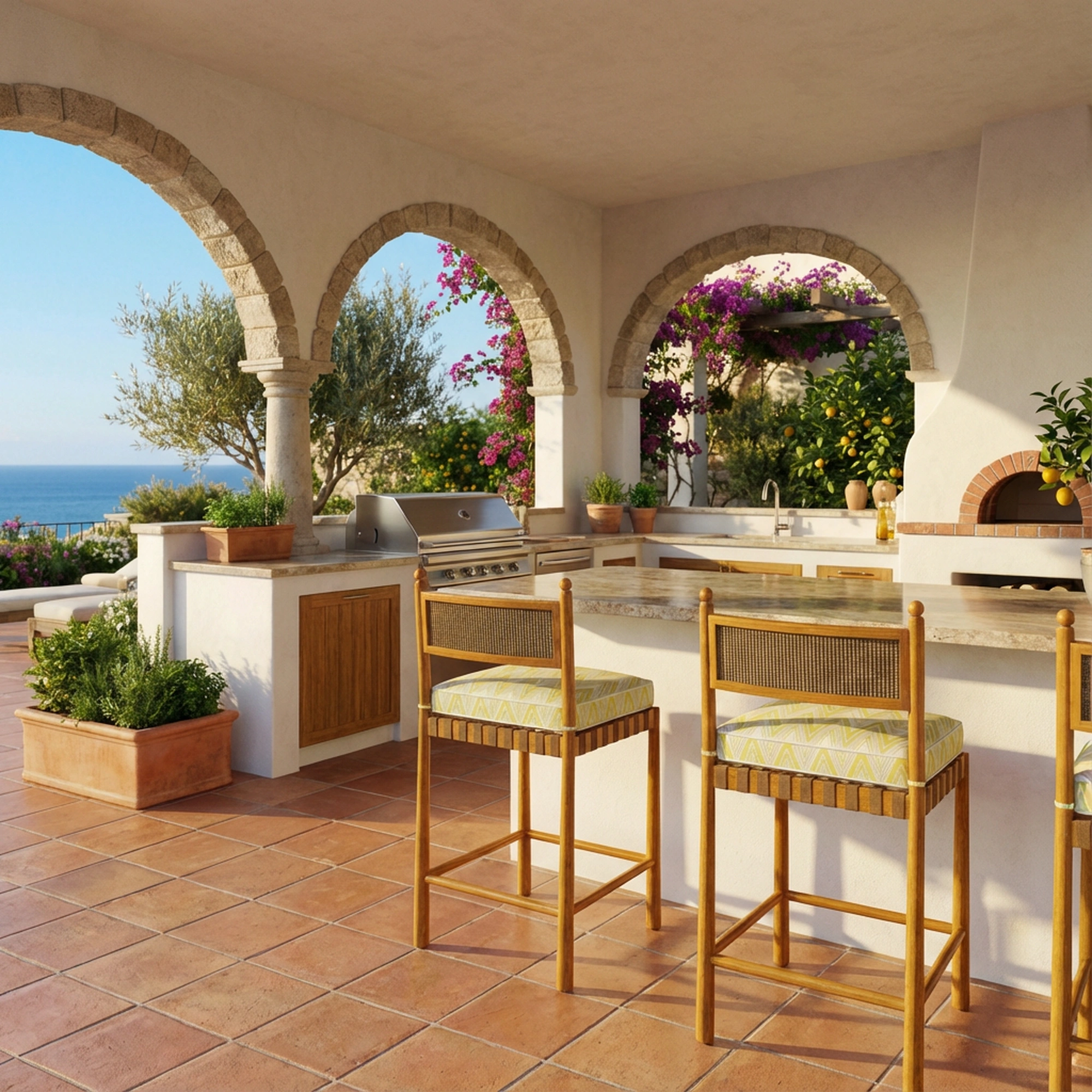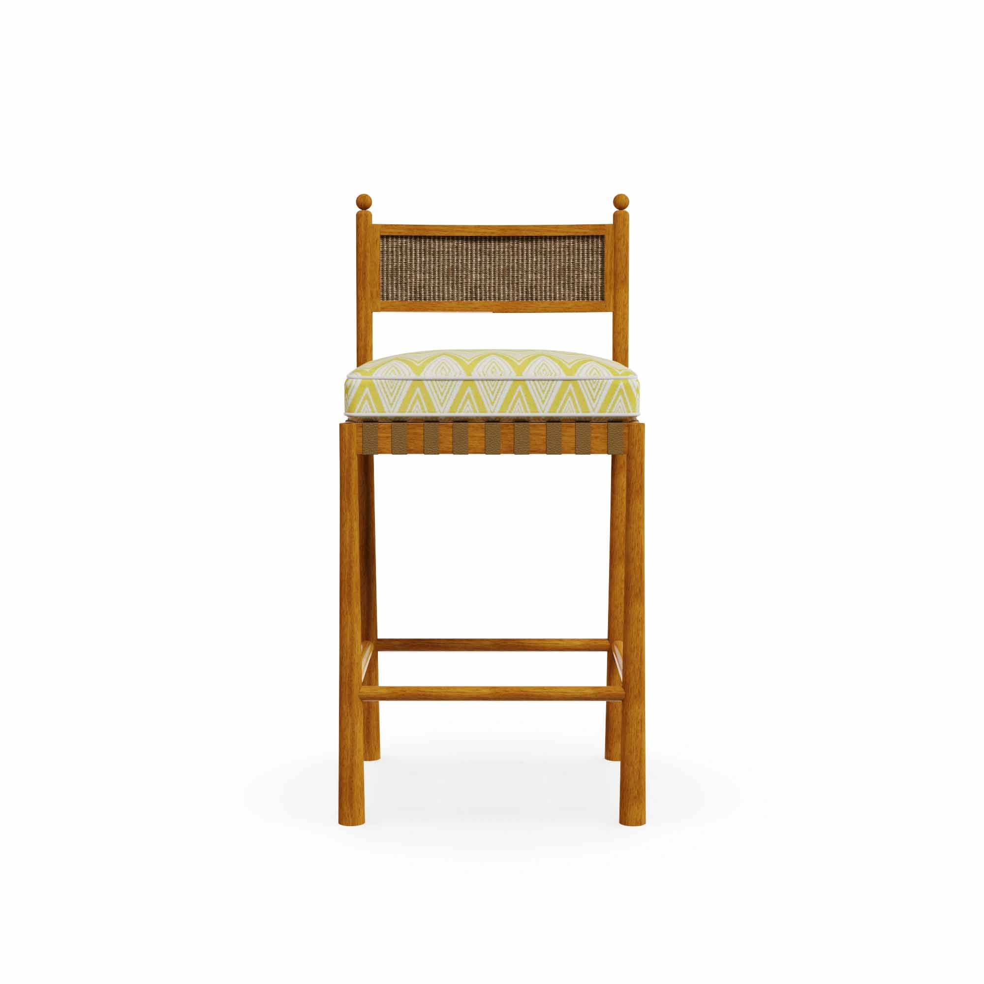 The Olbia Bar Chair by Mediterrazza is a timeless expression of outdoor luxury furniture, handcrafted in noble iroko wood with sculptural conical legs that highlight its artisanal character. The back, made of high-performance synthetic jute, ensures durability, while the seat wrapped in synthetic leather is paired with a soft cushion upholstered in a colorful Mediterranean-inspired fabric with elegant piping. Designed for both residential and hospitality spaces, Olbia blends comfort, sophistication, and Mediterranean charm in every detail.