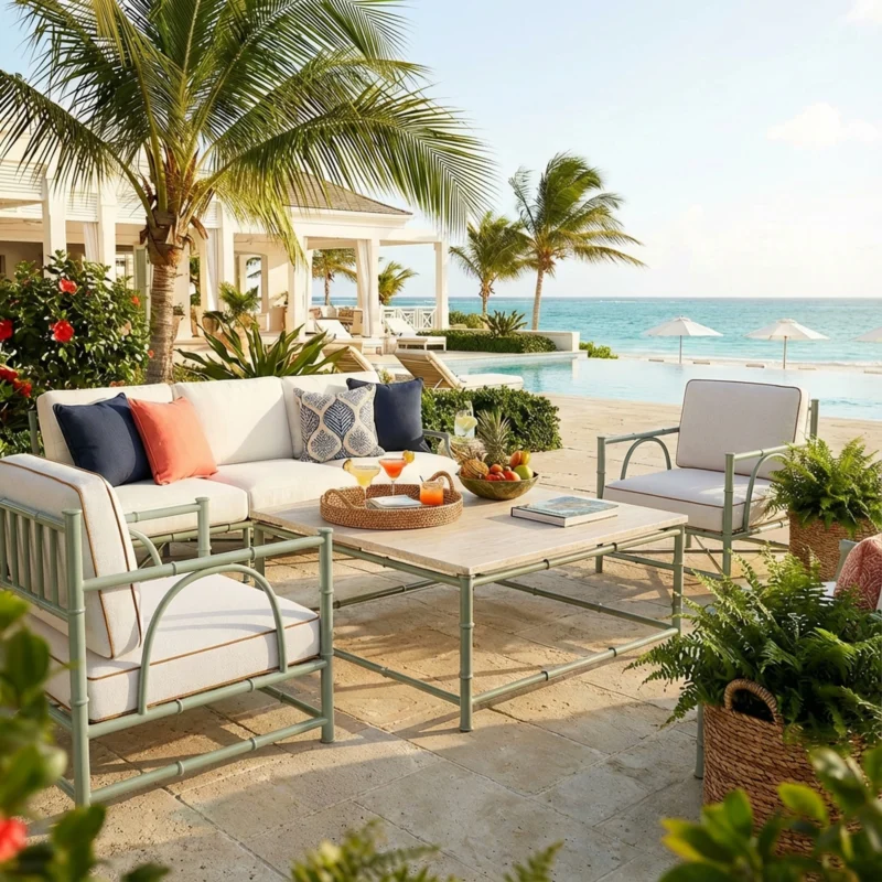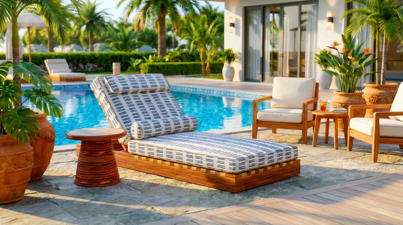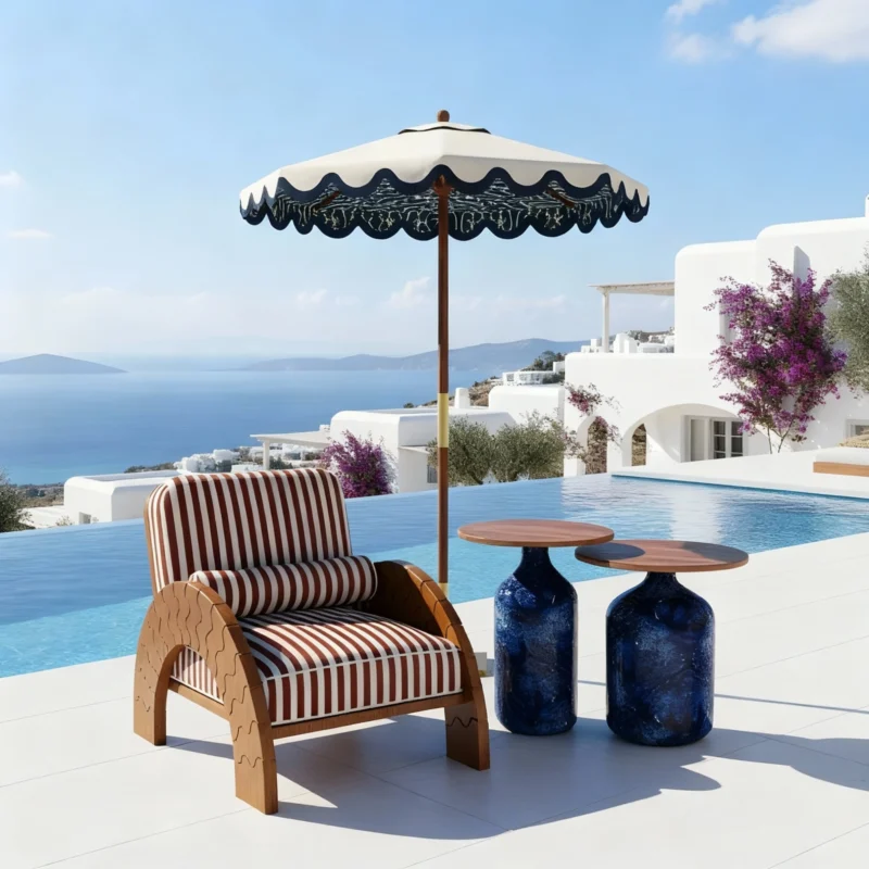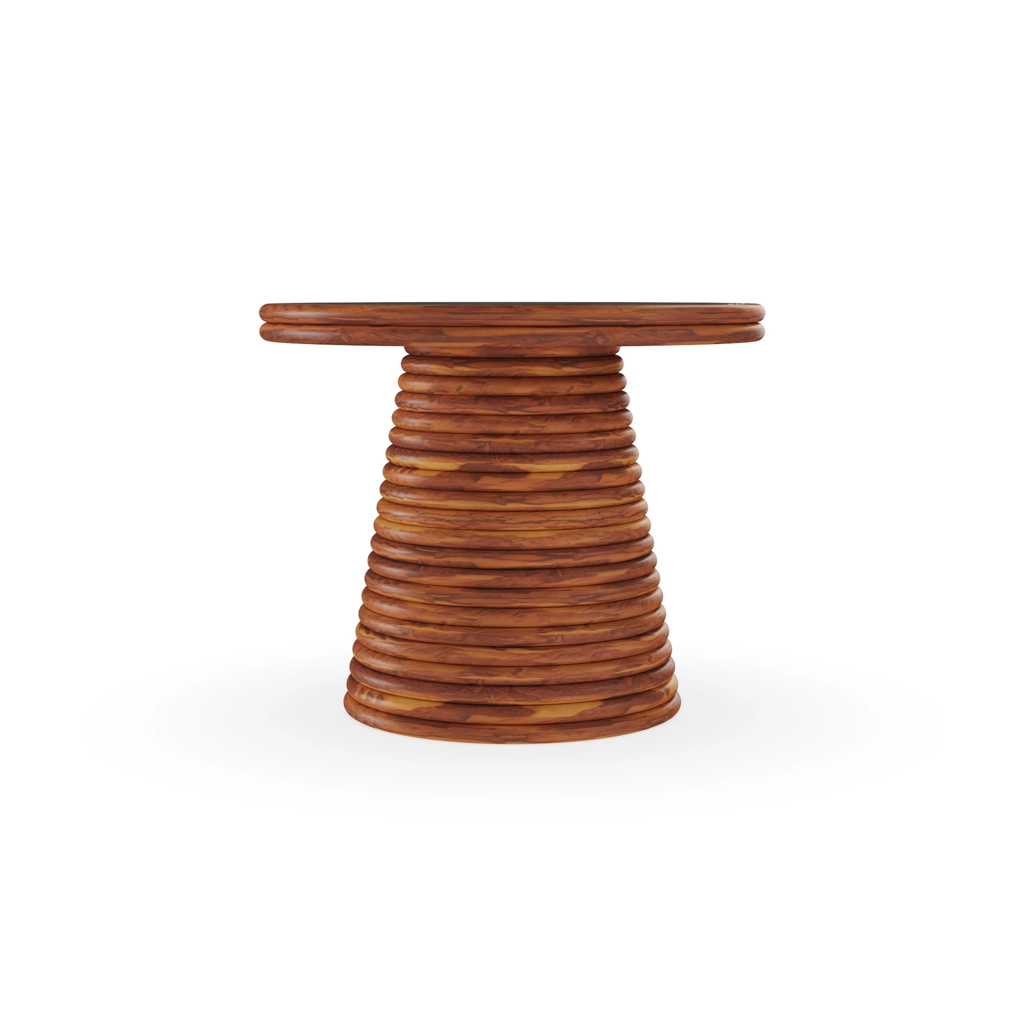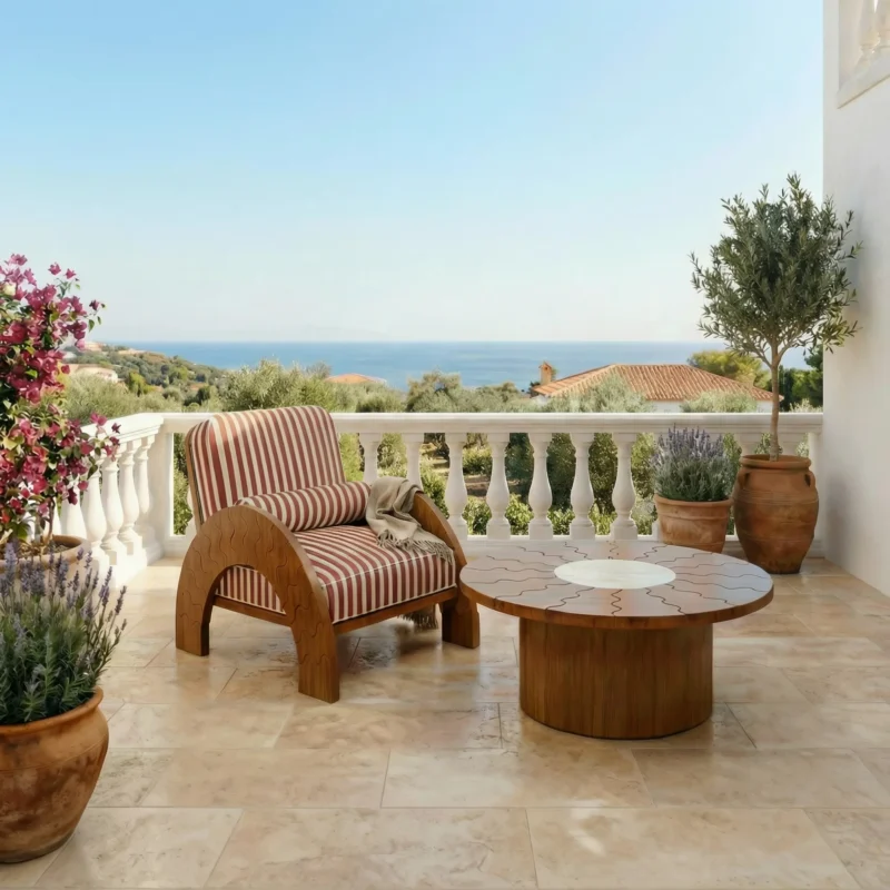 The Bari Side Table blends Mediterranean elegance with a bohemian-inspired design. Handcrafted with an inlaid travertine top and a ribbed iroko wood base, this piece is both durable and stylish, perfect for outdoor living. Its sculptural silhouette and vintage-inspired details add a timeless charm, making it an ideal accent table for terraces.