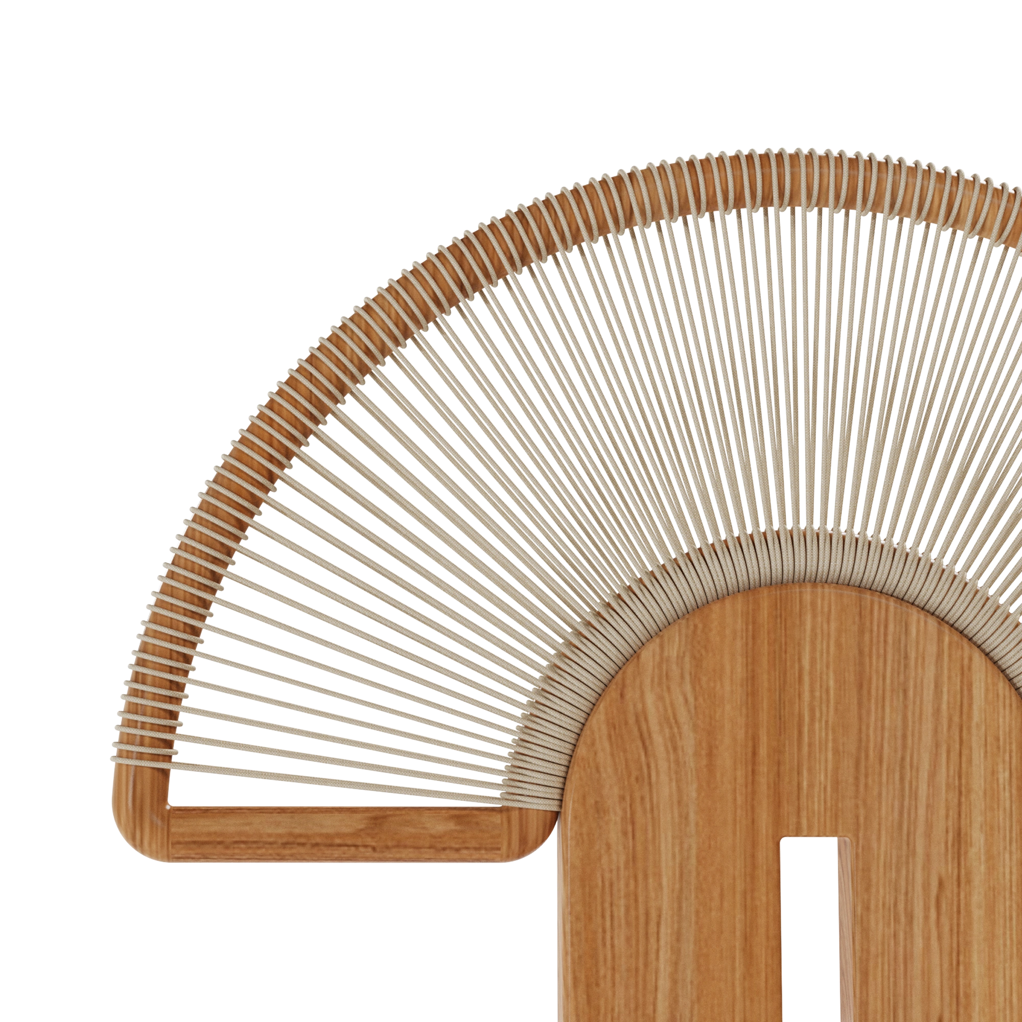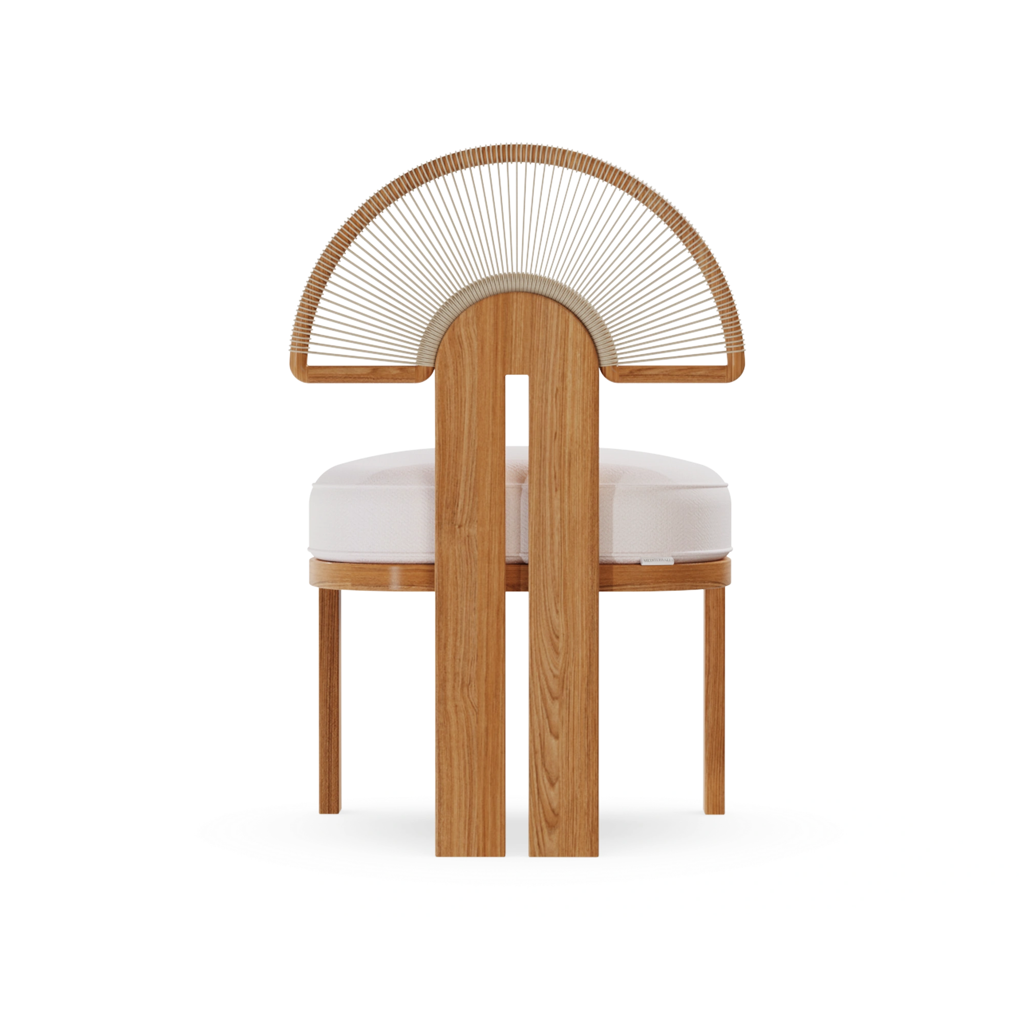 The Antibes Dining Chair is a sculptural piece that celebrates Mediterranean elegance and craftsmanship. Expertly crafted in iroko wood, it is perfectly suited for outdoor use, ensuring both durability and natural beauty. The distinctive backrest, detailed with synthetic cord arranged in a sun-inspired pattern, adds an artistic touch while evoking the warmth of Mediterranean landscapes. Designed with meticulous attention to detail, the Antibes Bar Chair blends comfort and style.