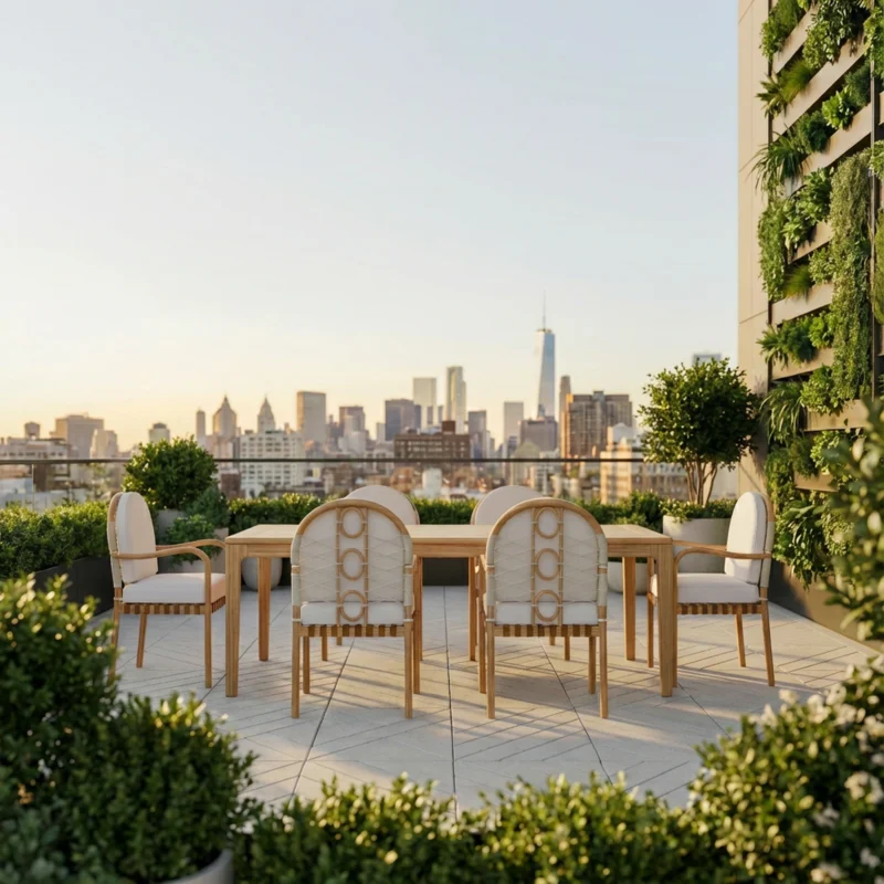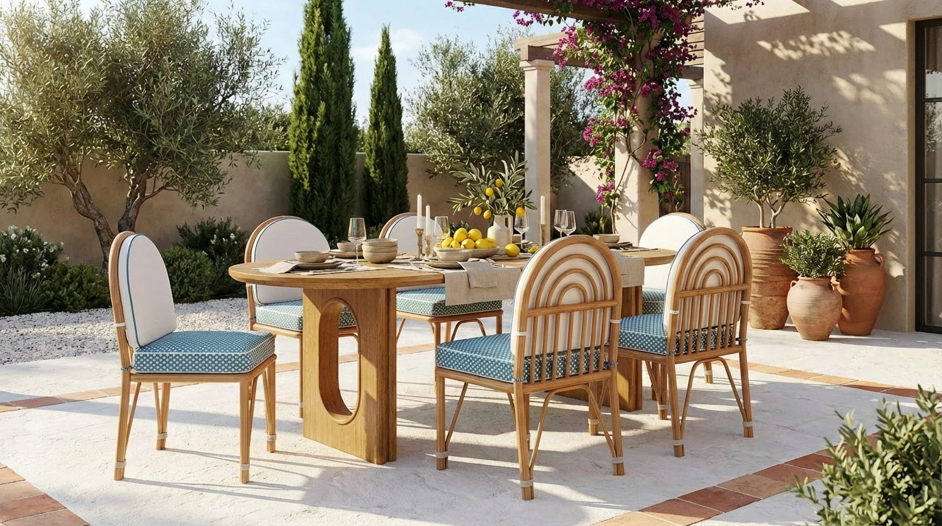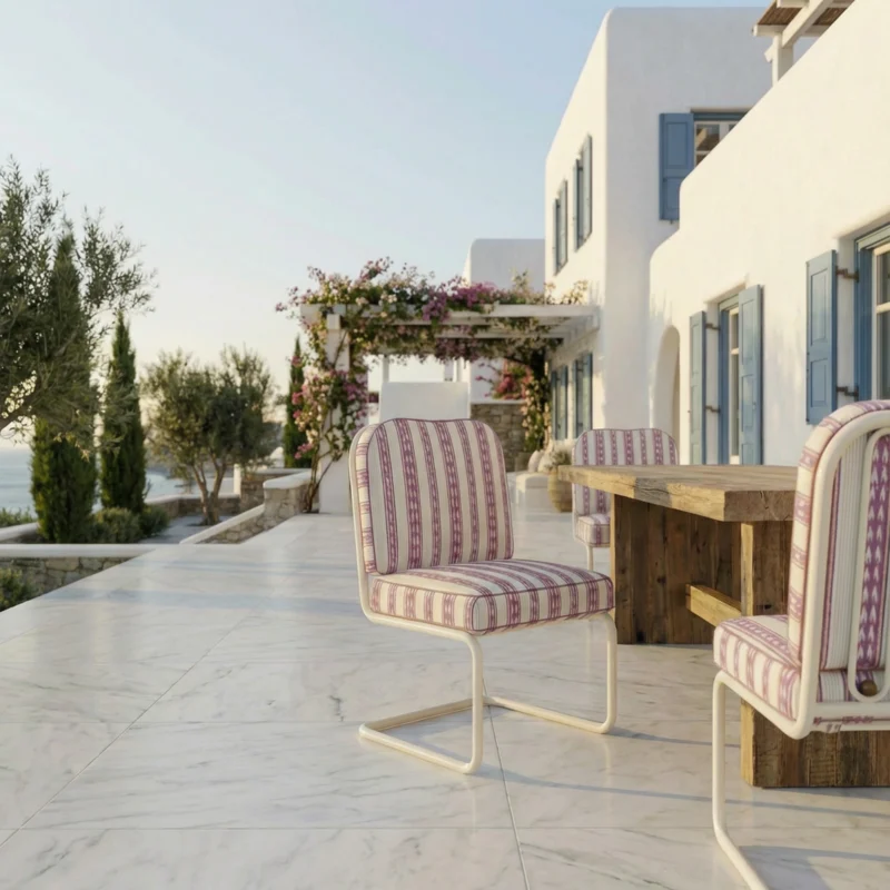 The Corfu Dining Chair captures timeless Mediterranean charm with a vintage-inspired silhouette and refined craftsmanship. Expertly crafted in iroko wood, this piece is designed for durability and elegance in any outdoor setting. The decorative patterned details and carefully considered proportions highlight attention to detail, while the upholstered seat brings comfort and style.