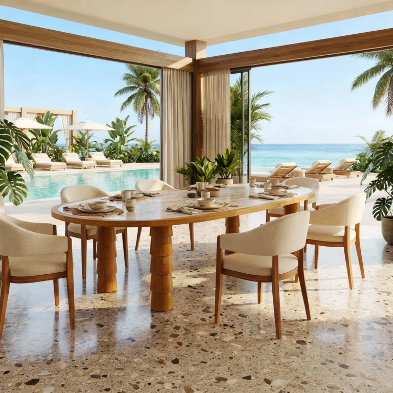 Timeless seaside dining, where design blends natur Timeless seaside dining, where design blends naturally with the landscape.