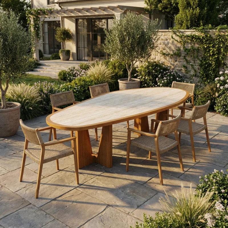 The Macarella Dining Table is a true statement of Mediterranean craftsmanship, designed for those who seek elegance in Outdoor Luxury Furniture. Handcrafted in solid iroko wood, its sculptural carved legs bring a bold yet refined character, while the inlaid travertine top with organic shaping highlights the natural beauty of Mediterranean materials. Perfectly suited for outdoor living, this dining table blends timeless design with durability, making it ideal for both residential and hospitality projects.