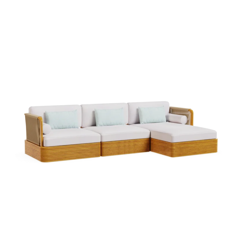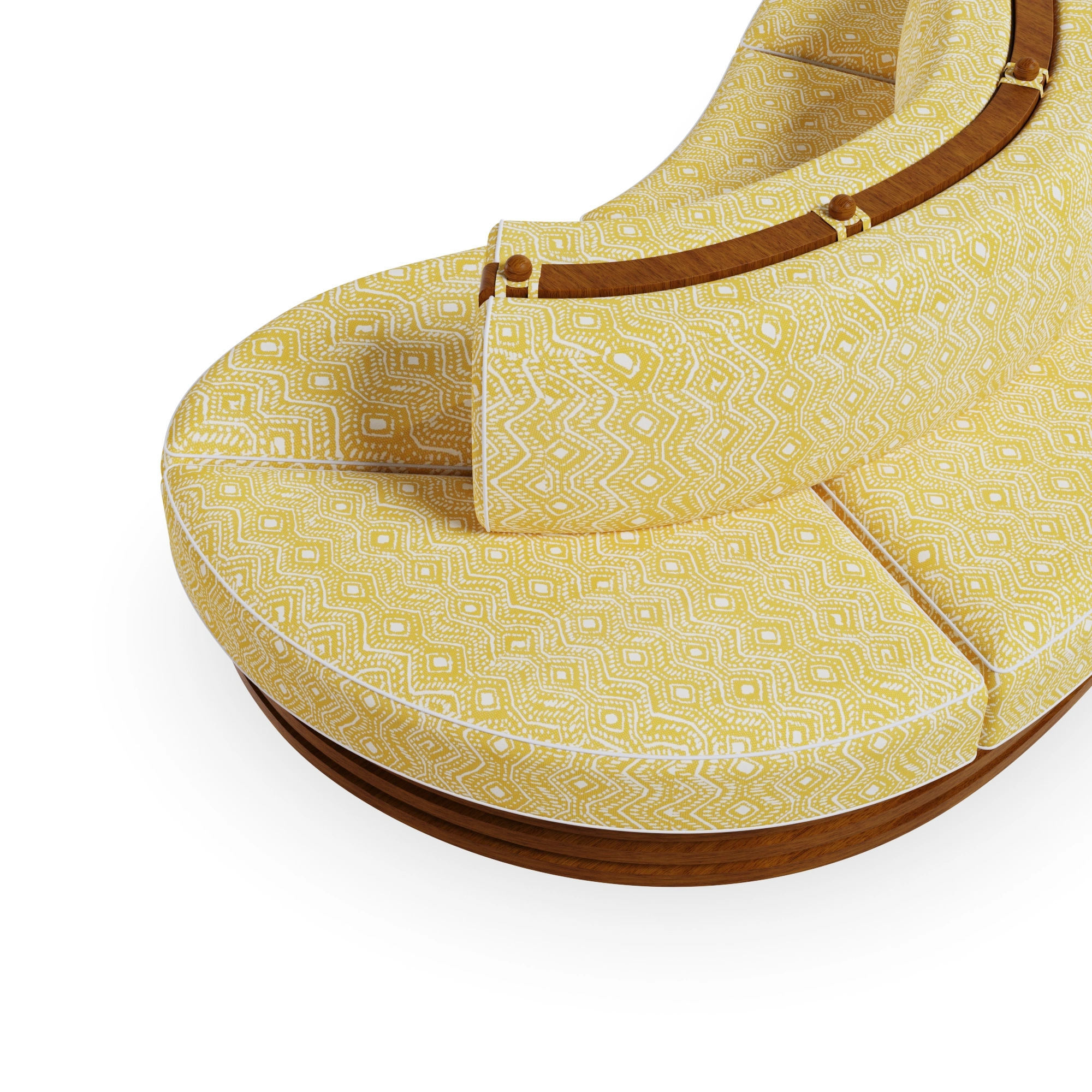 The Camogli Sofa by Mediterrazza is a radiant expression of outdoor luxury furniture, handcrafted in durable iroko wood to ensure lasting outdoor performance. Its organic lines echo the soft, flowing shapes of the Mediterranean, while the vibrant yellow patterned fabric brings warmth and energy, reminiscent of the sunlit coast. Designed for both residential terraces and hospitality projects, Camogli combines artisanal craftsmanship, comfort, and Mediterranean charm in one timeless piece.