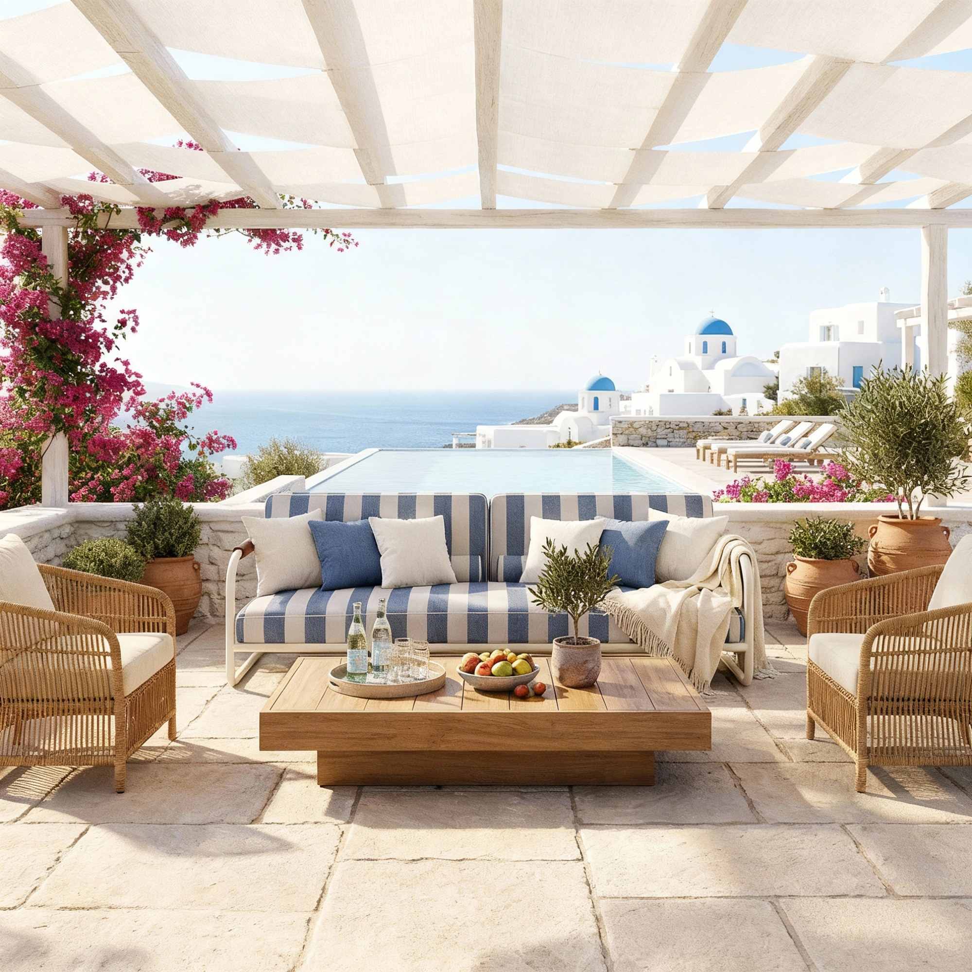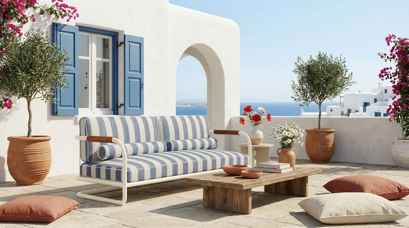 The Mougins Sofa embodies Mediterranean elegance with a modern twist. Hand-crafted in lacquered metal, this piece is built to withstand outdoor living while showcasing refined design. Its carefully detailed back features subtle iroko wood accents, adding warmth and natural texture. Upholstered in striped fabric, the sofa offers generous depth and height for unmatched comfort, complemented by cylindrical cushions for a timeless coastal aesthetic.