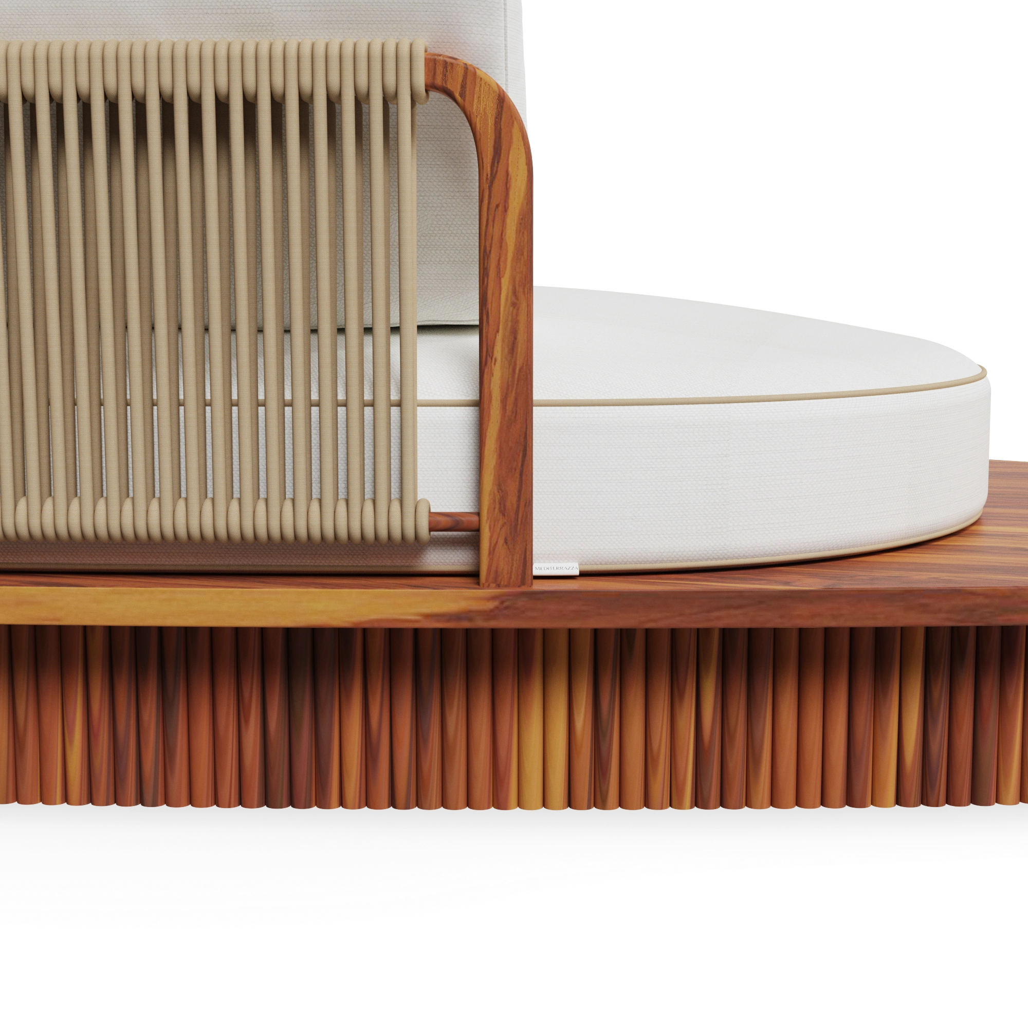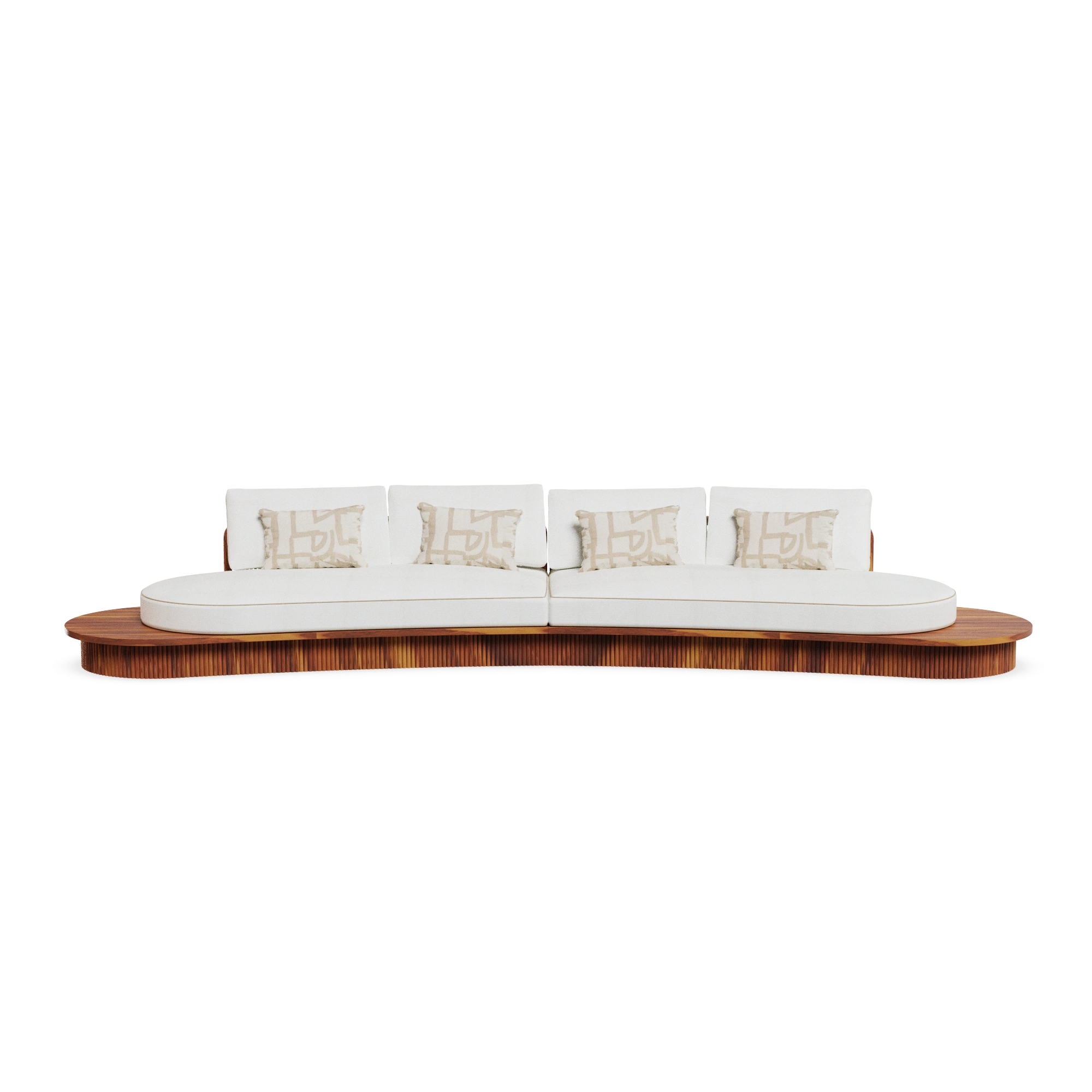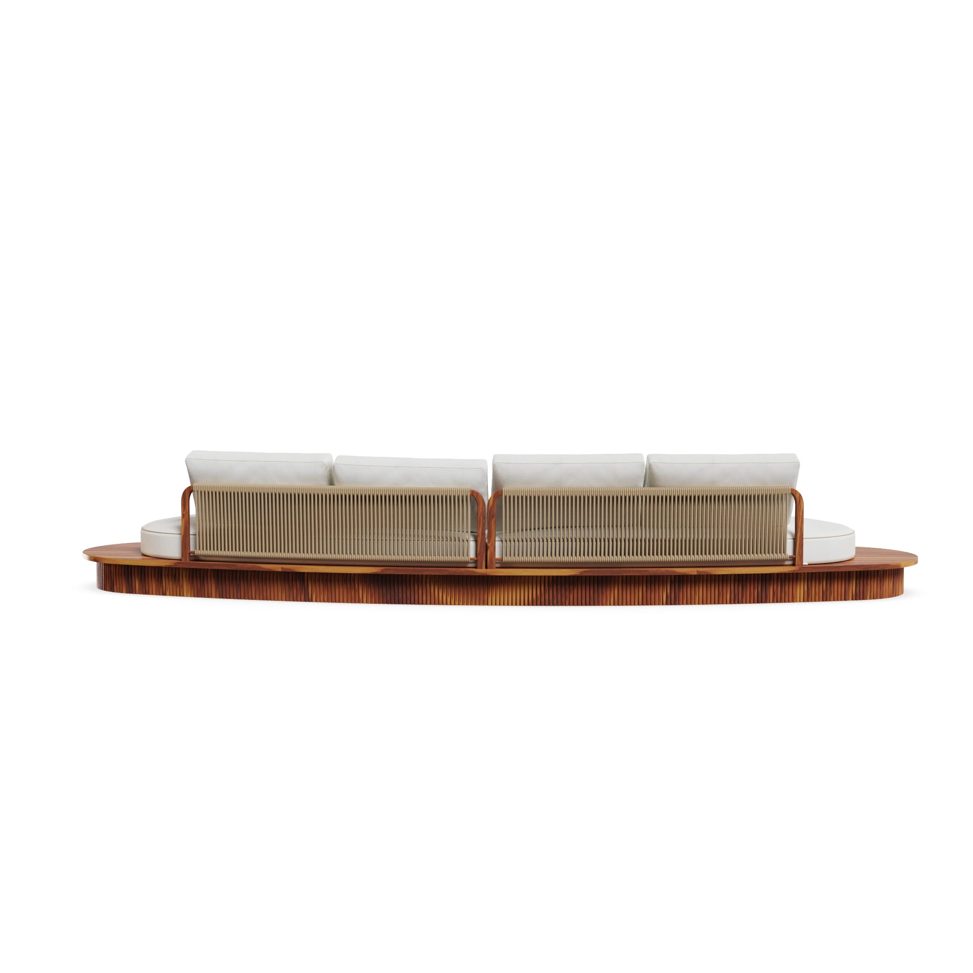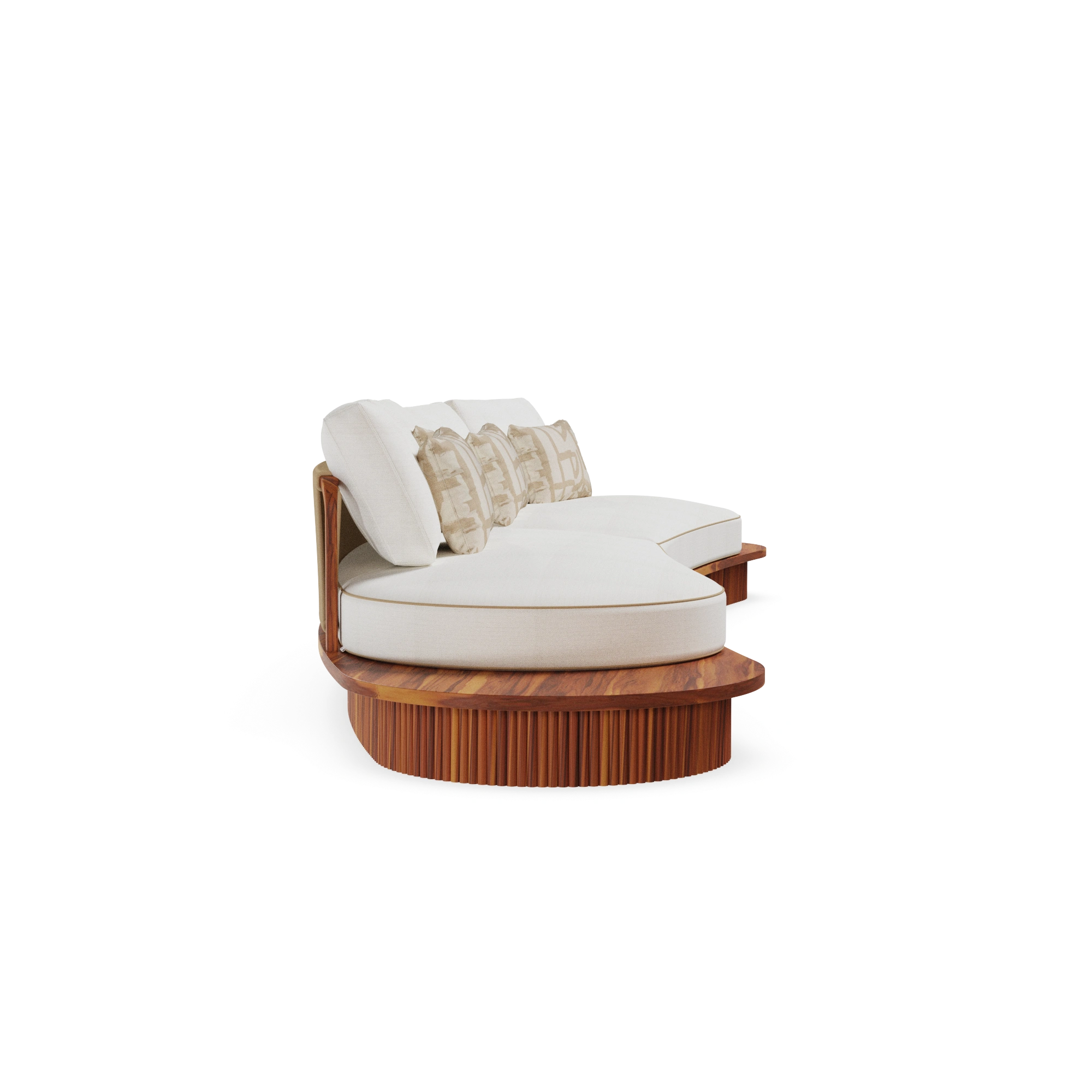 The Sorrento Sofa is a statement of elegance and craftsmanship, hand-crafted in durable iroko wood and designed to elevate any outdoor setting. Its organic silhouette flows naturally, while the ribbed base detail adds depth and sophistication. The carefully designed back features refined cord elements, showcasing meticulous attention to detail.Complete with generously padded back and seat cushions, the Sorrento Sofa ensures exceptional comfort.