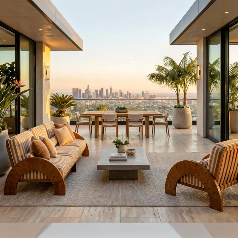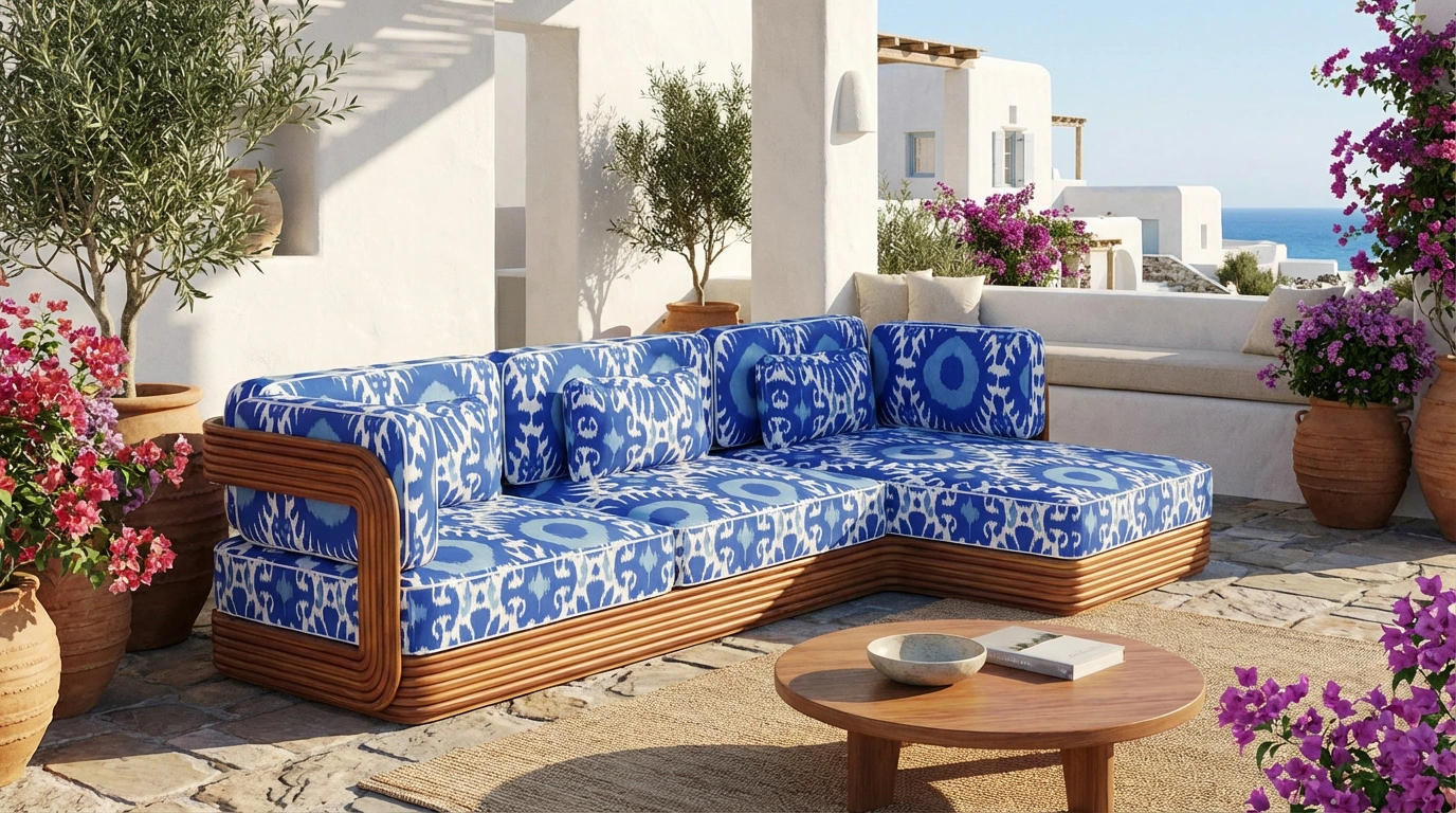 The Taormina Sofa is a statement of Mediterranean elegance and comfort. Handcrafted in durable iroko wood, it is designed to withstand outdoor living while embodying timeless sophistication. Its sculptural back is carefully detailed with cord elements, adding both texture and artistry, while the solid base reflects a bohemian vintage-inspired style. Plush seat and back cushions upholstered in a striking Mediterranean Ikat pattern.