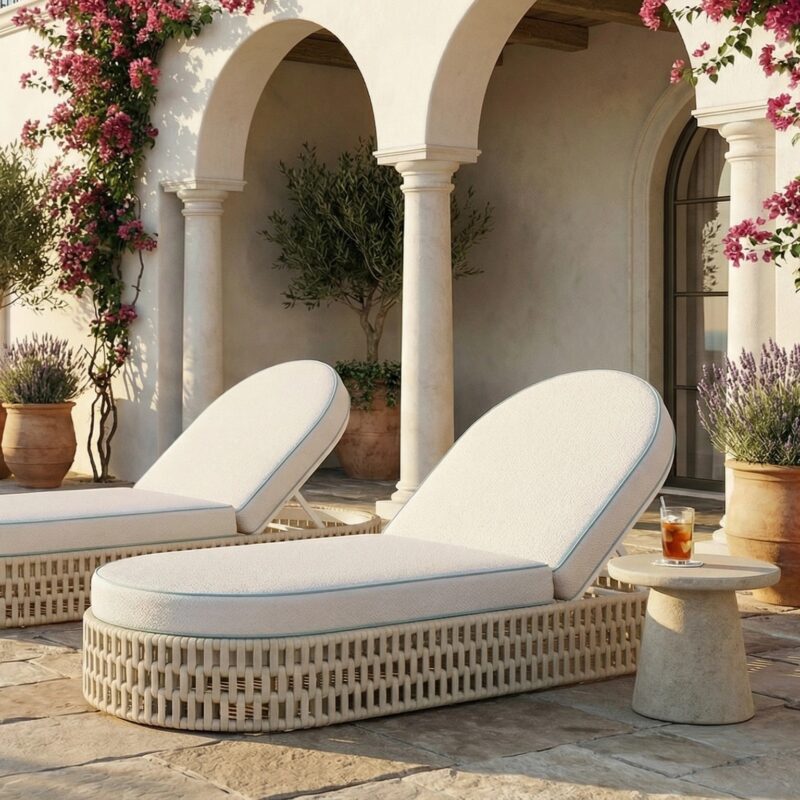 The Cassis Sun Lounger blends Mediterranean elegance with modern craftsmanship. Handcrafted in durable iroko wood, this piece is designed for outdoor living. The double backrest features intertwined synthetic leather straps that ensure both style and support, while the striped fabric cushions add a fresh, coastal charm.