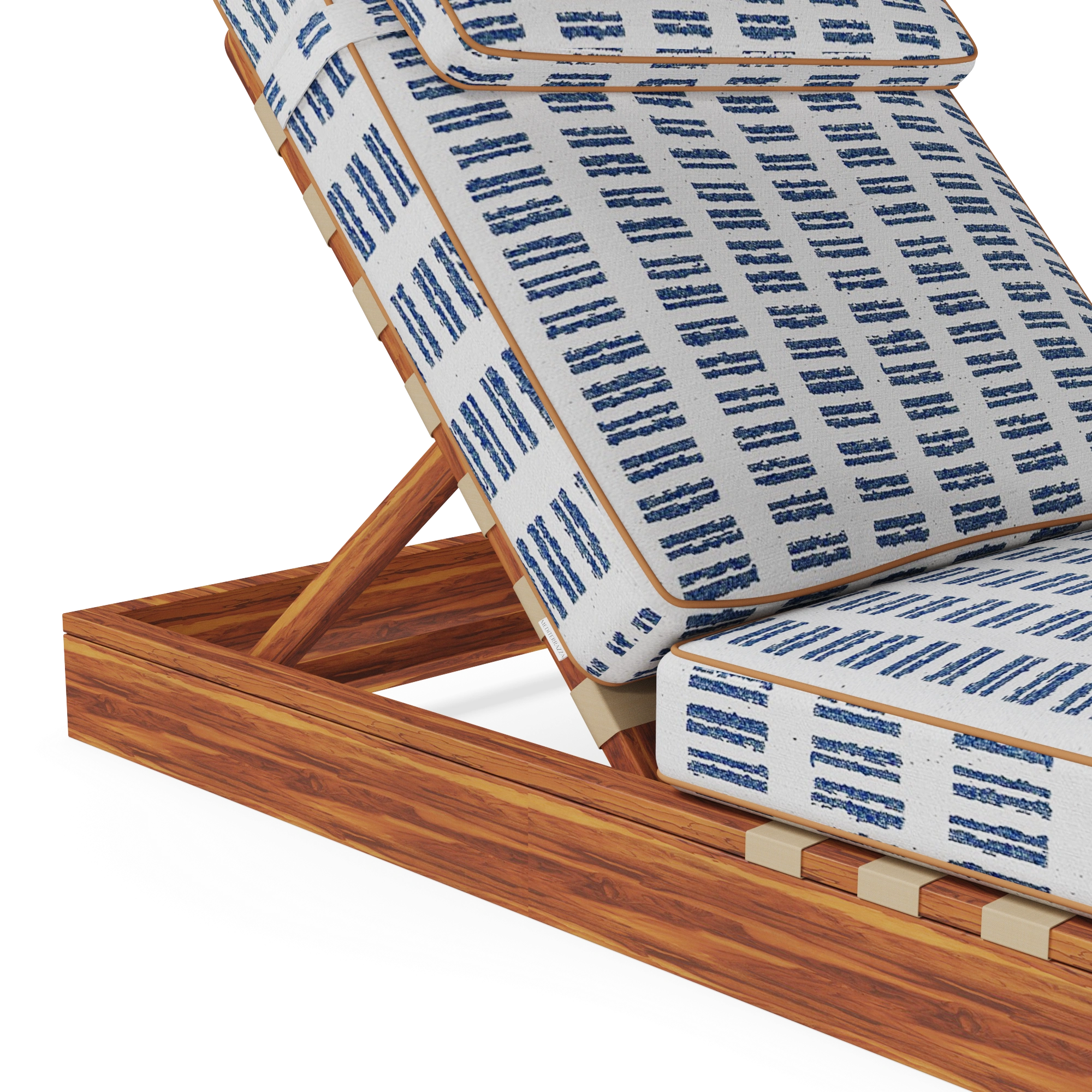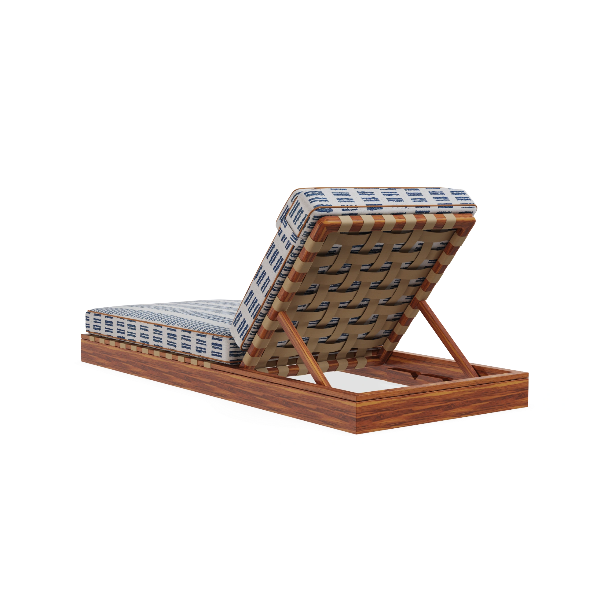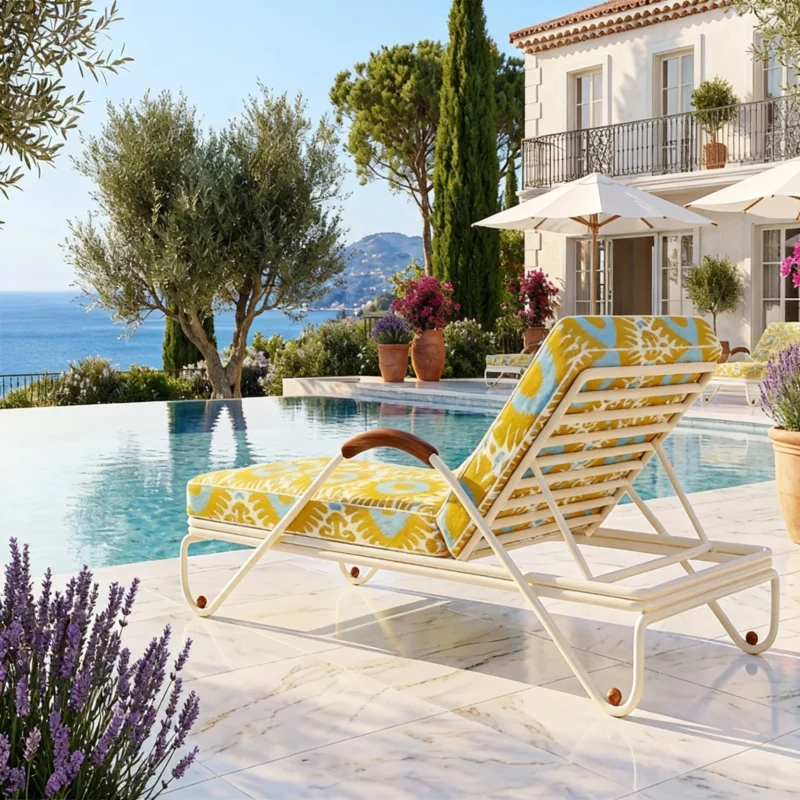 The Corsica Sun Lounger is carefully hand-crafted in iroko wood, this piece is designed to withstand outdoor living while offering timeless elegance. Its adjustable back, finished in durable synthetic leather, ensures the perfect inclination for ultimate comfort. The generously padded seat and back cushions, dressed in a Mediterranean-inspired patterned fabric with delicate piping detail, elevate the design with sophistication.