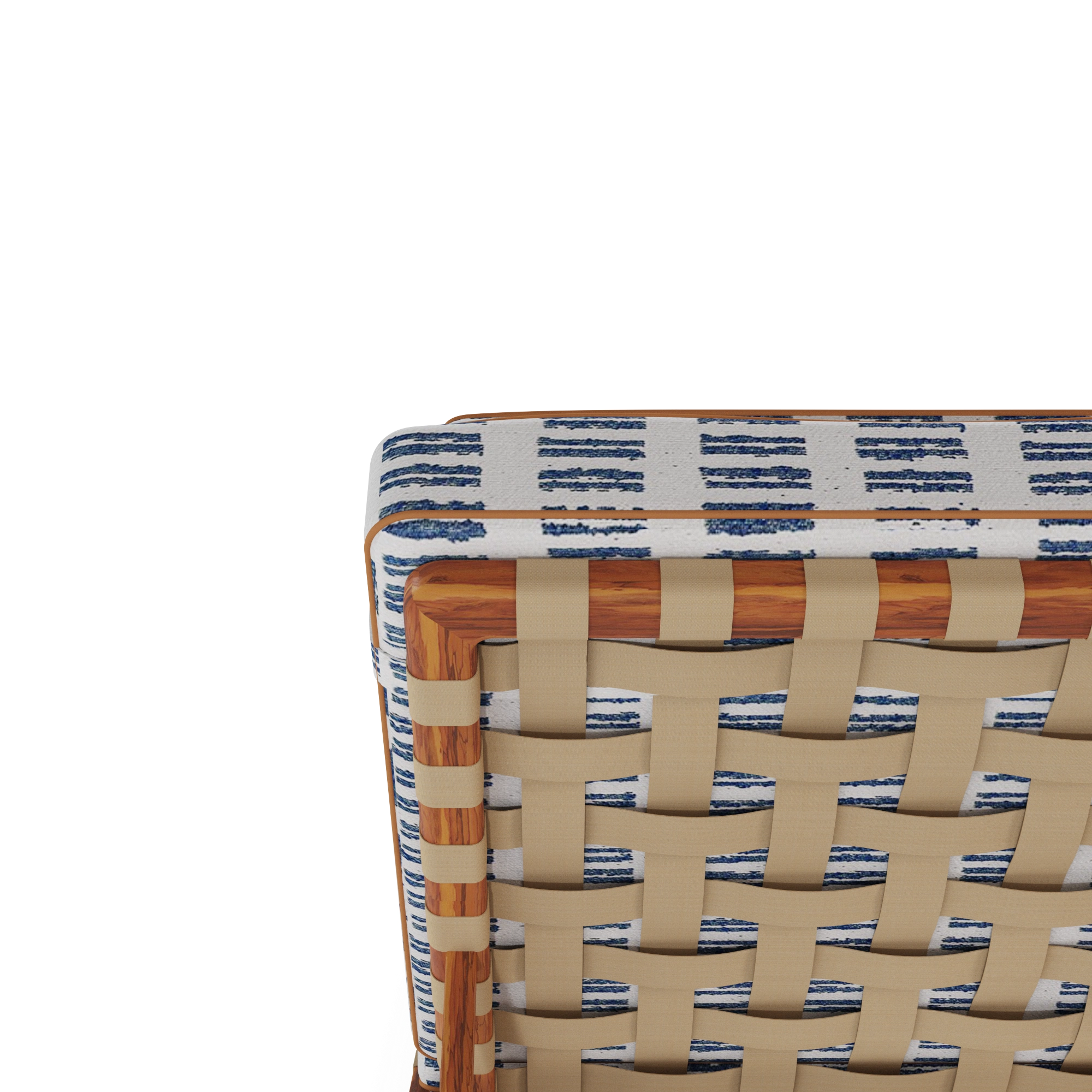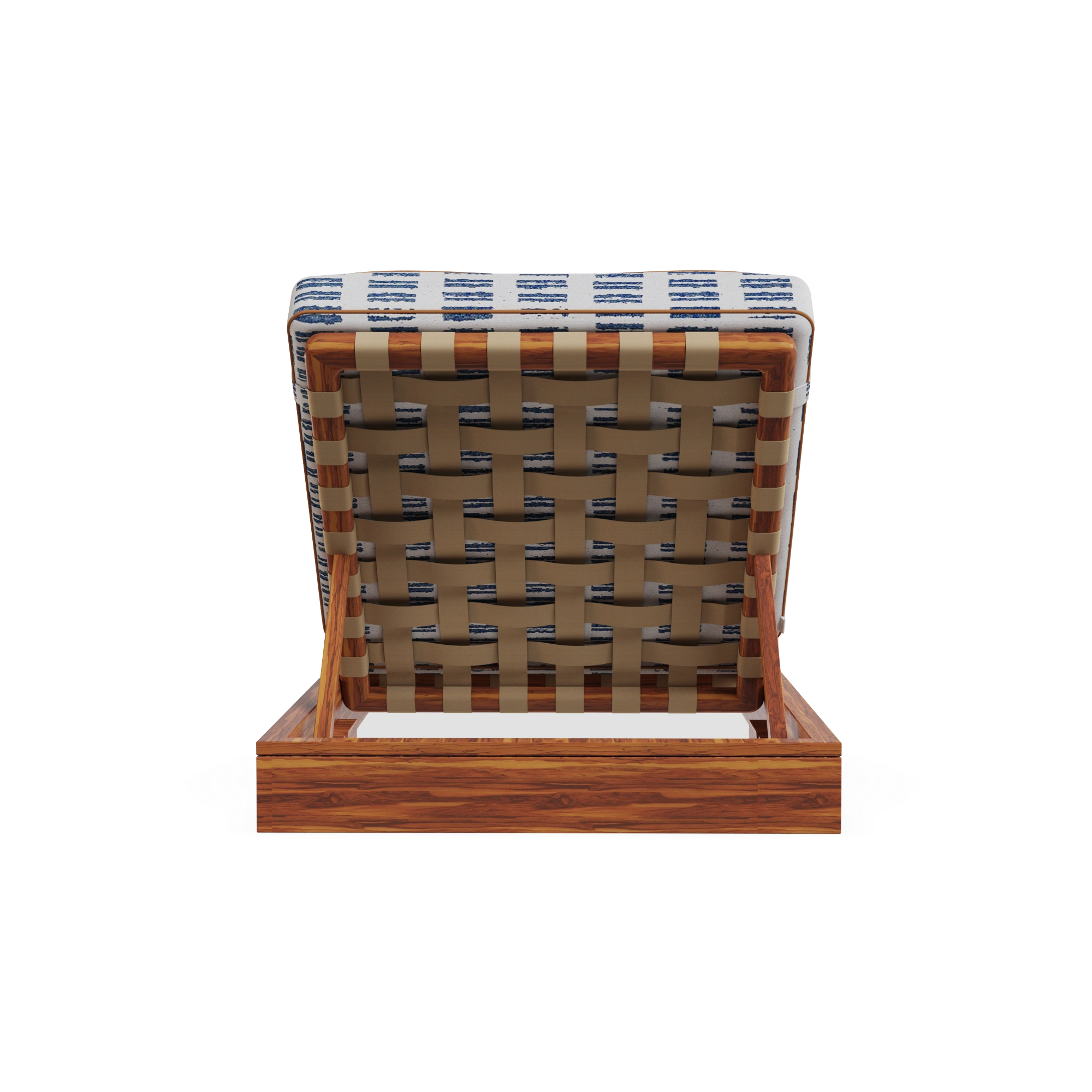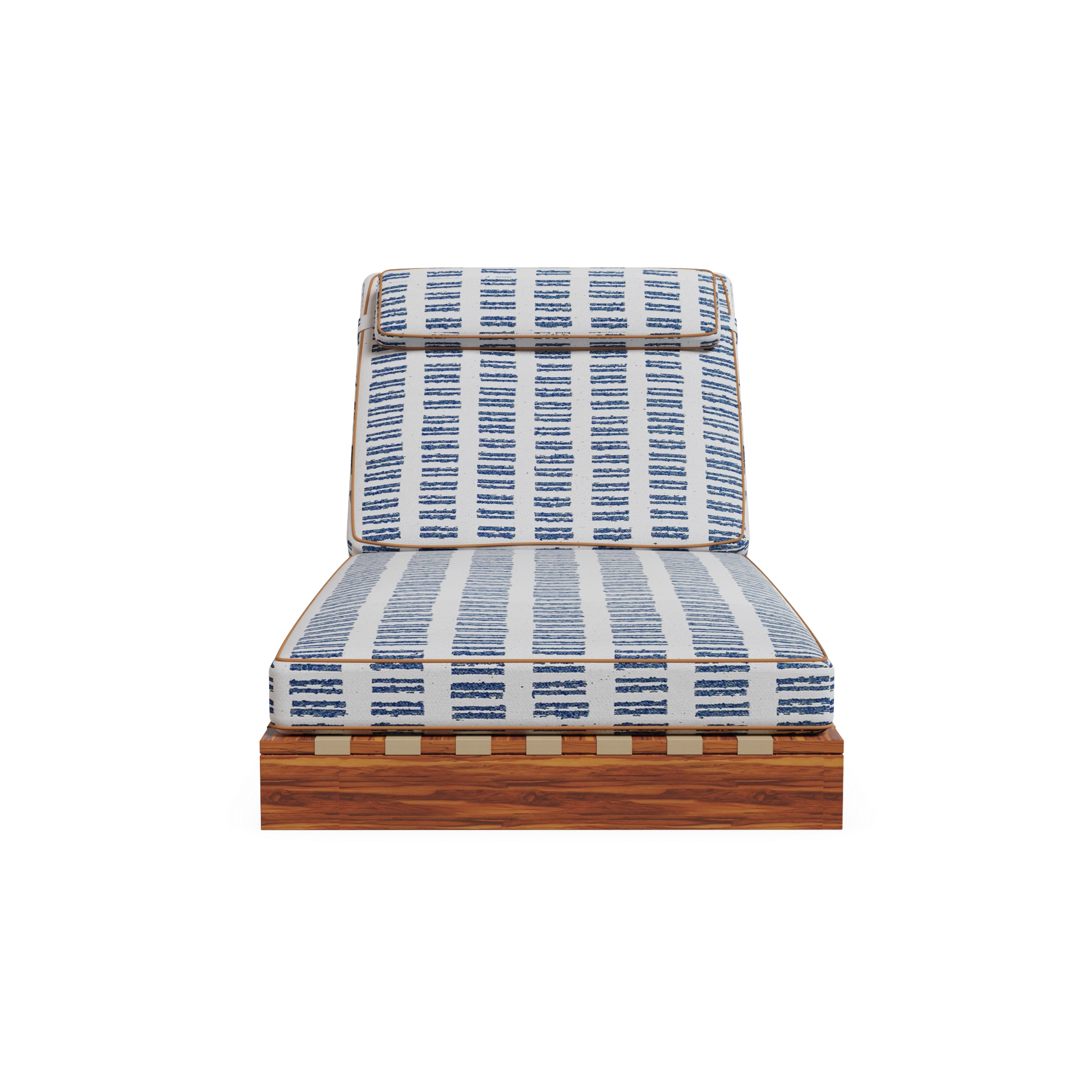 The Corsica Sun Lounger is carefully hand-crafted in iroko wood, this piece is designed to withstand outdoor living while offering timeless elegance. Its adjustable back, finished in durable synthetic leather, ensures the perfect inclination for ultimate comfort. The generously padded seat and back cushions, dressed in a Mediterranean-inspired patterned fabric with delicate piping detail, elevate the design with sophistication.