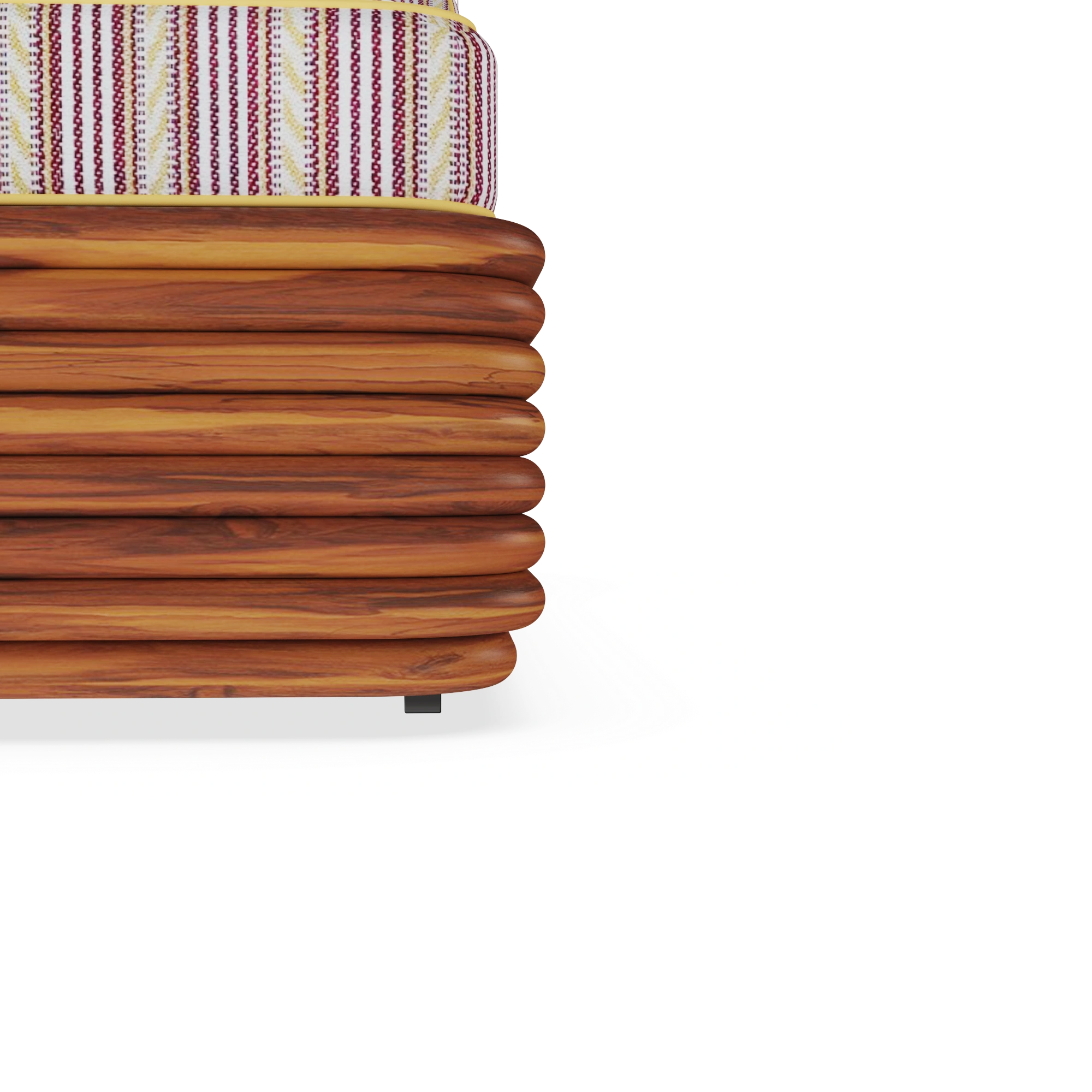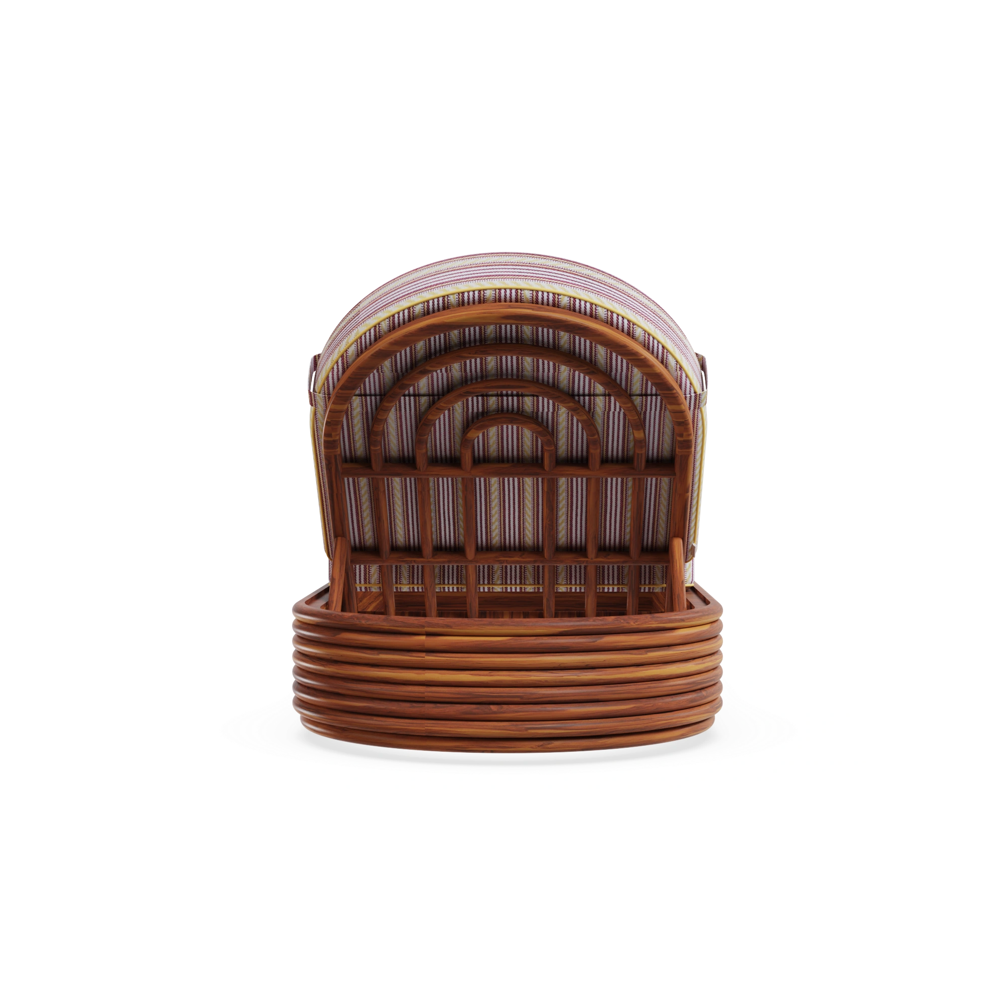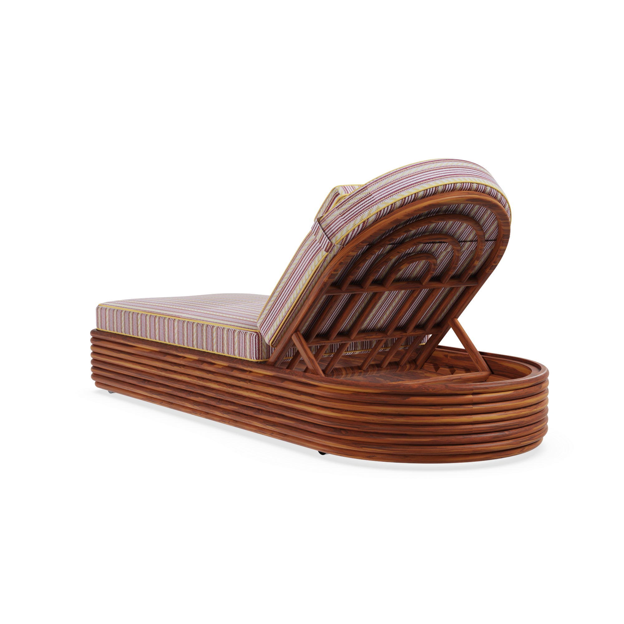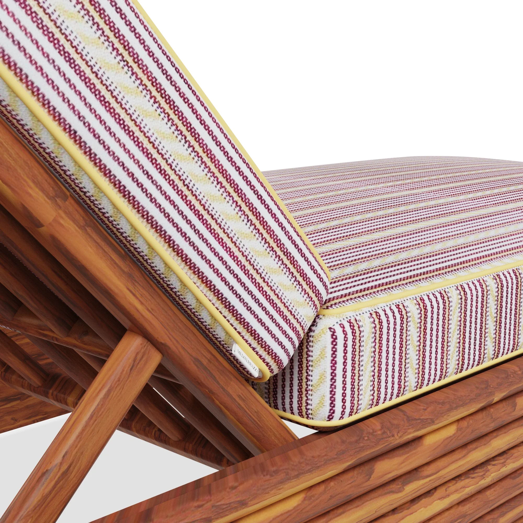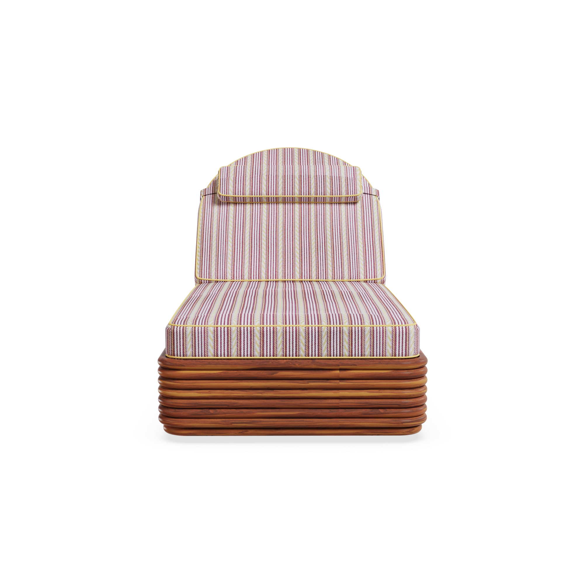 The Paros Sun Lounger is a true statement of outdoor luxury furniture, hand-crafted in iroko wood for durability and timeless beauty. Its ribbed base with a bohemian feel and decorative arched backrest bring an artisanal touch to outdoor living spaces. The striped Mediterranean pattern of the cushions, enhanced with refined piping, ensures both comfort and elegance. With an adjustable backrest for the perfect inclination, Paros is designed to combine relaxation with elevated design, making it ideal for both residential and hospitality projects.