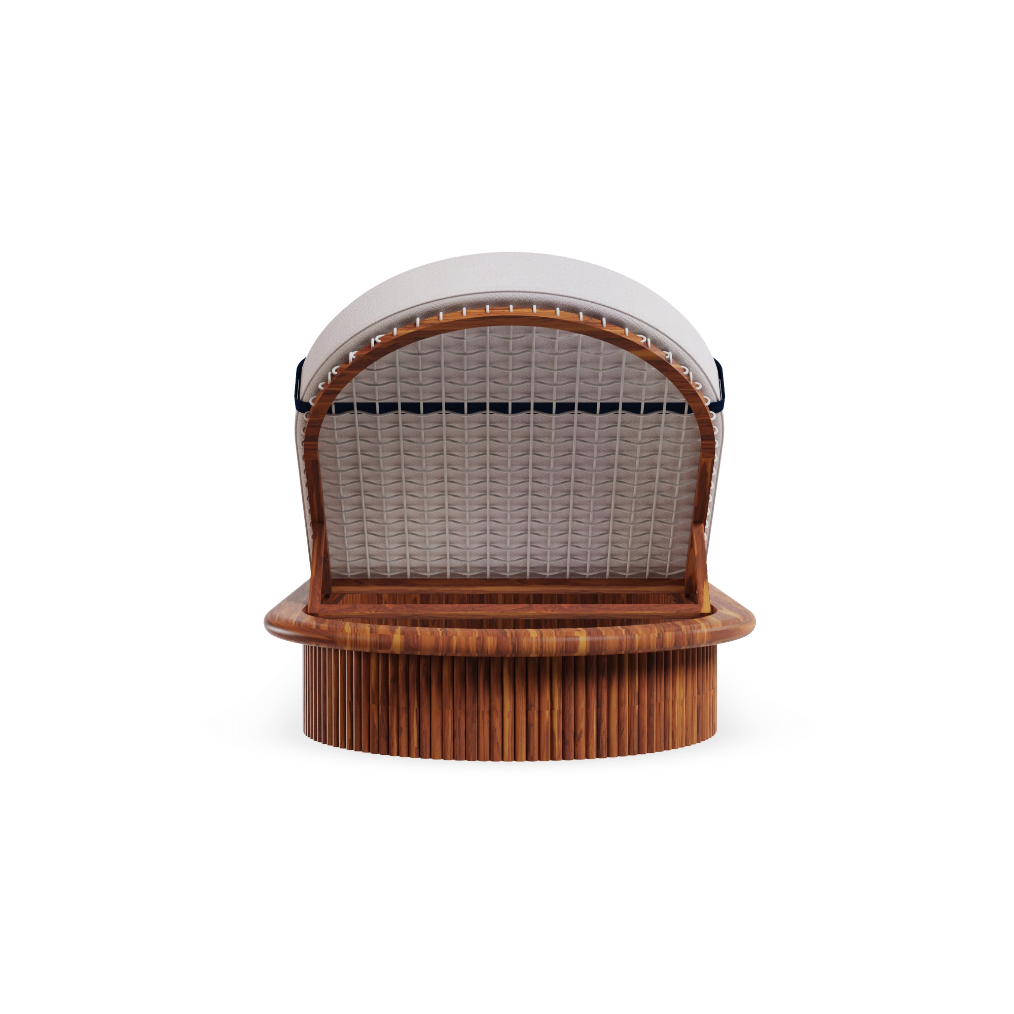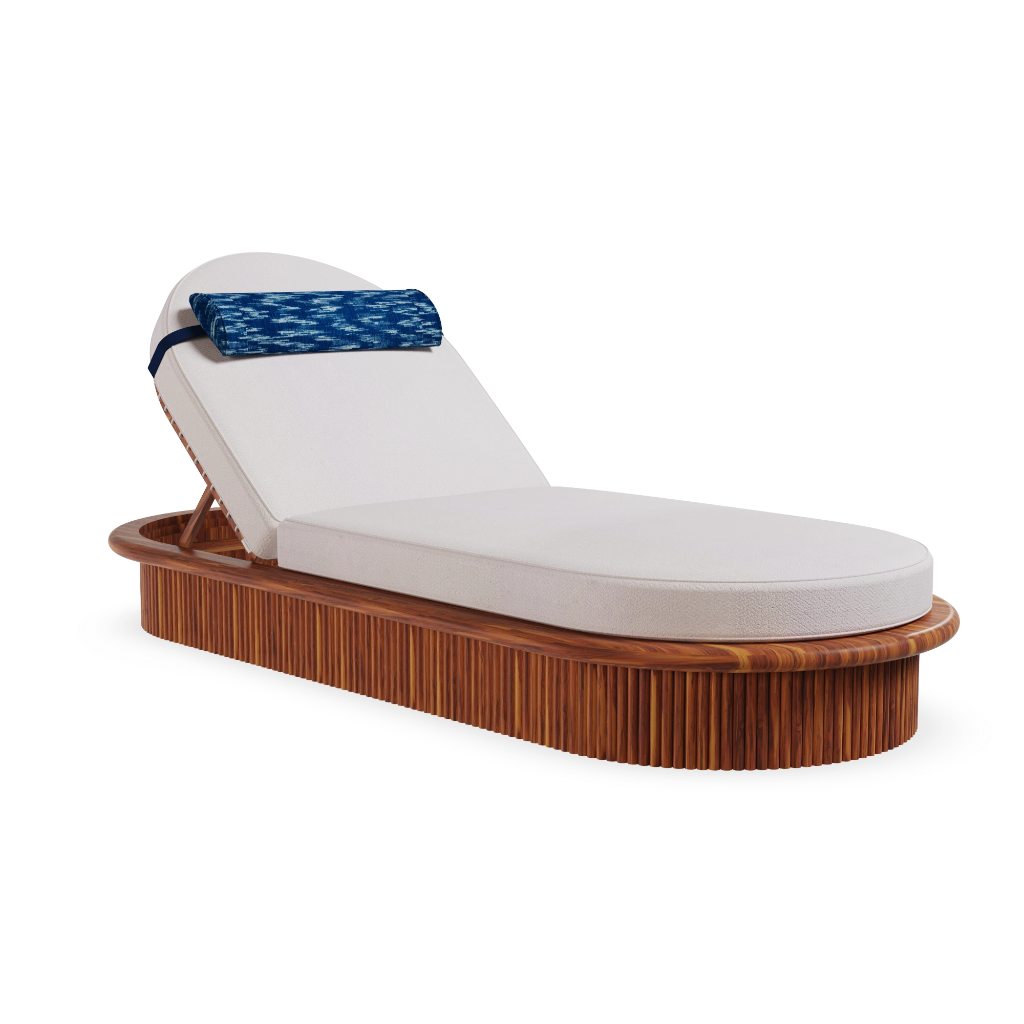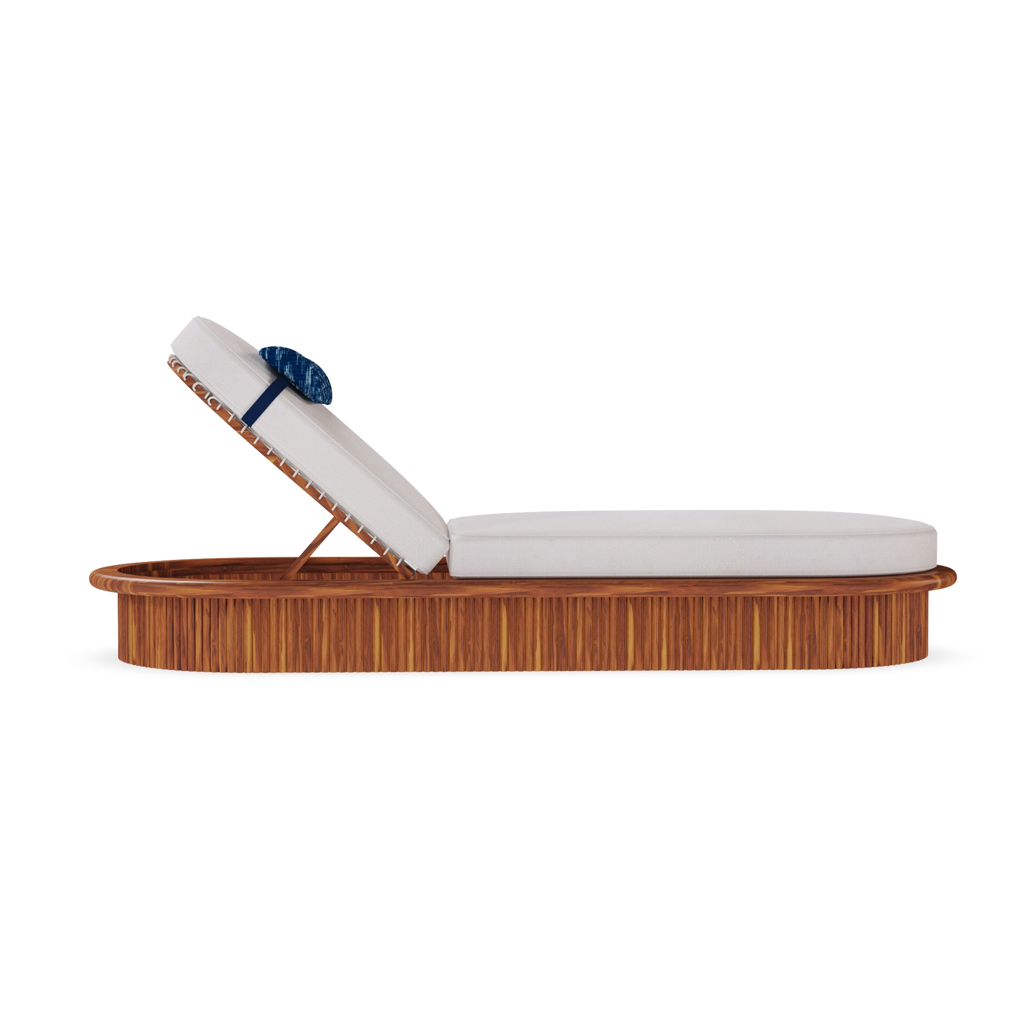 The Sóller Sun Lounger is a statement piece of outdoor luxury furniture, handcrafted in iroko wood for lasting durability and natural elegance. Designed with a ribbed base that enhances its bohemian yet sophisticated character, it combines function and artistry. The adjustable backrest in synthetic leather ensures flexibility, while the decorative coastal-tone cushion adds both comfort and style. Its generously padded seat and back cushion are crafted to deliver exceptional relaxation, making Sóller the perfect addition to any Mediterranean-inspired outdoor space.