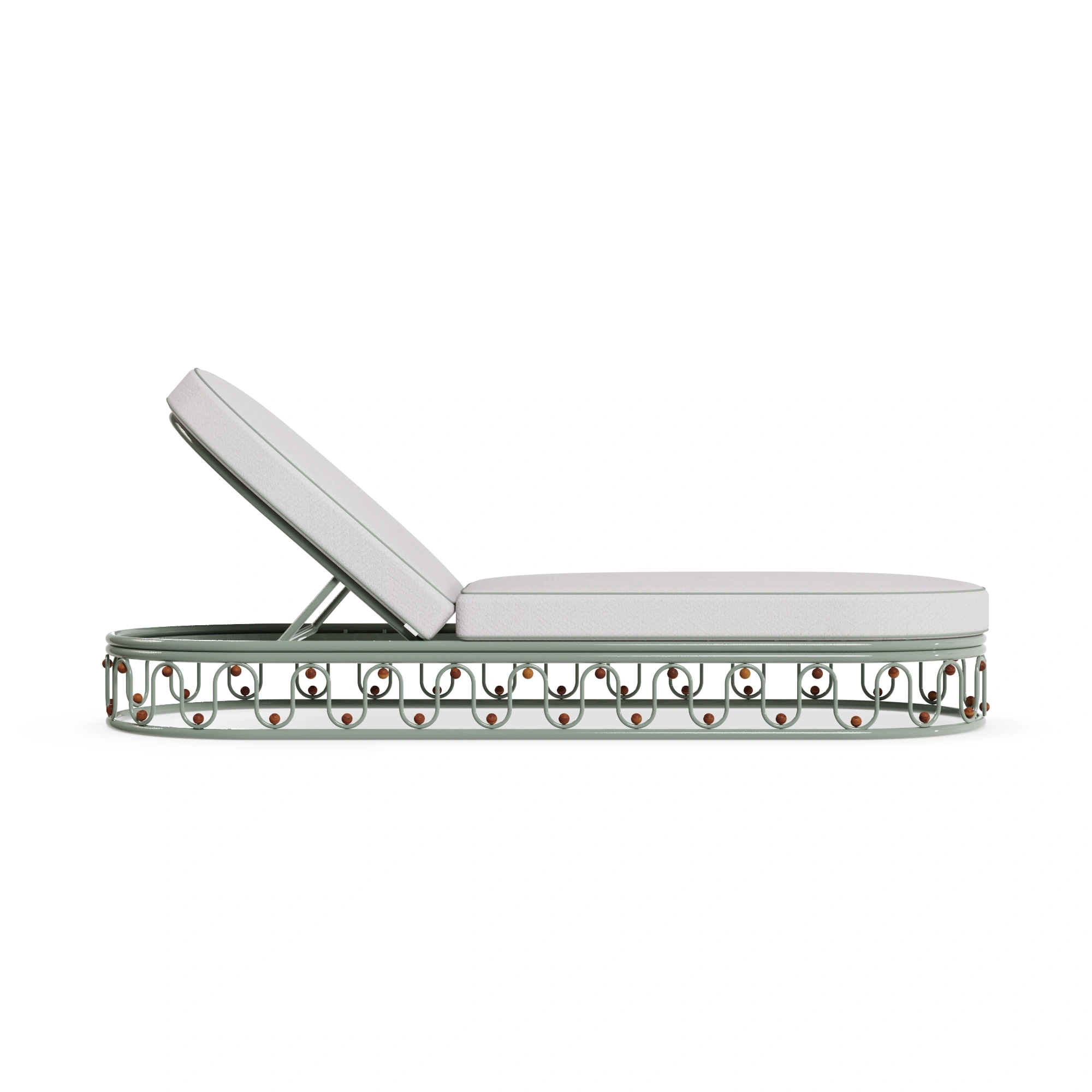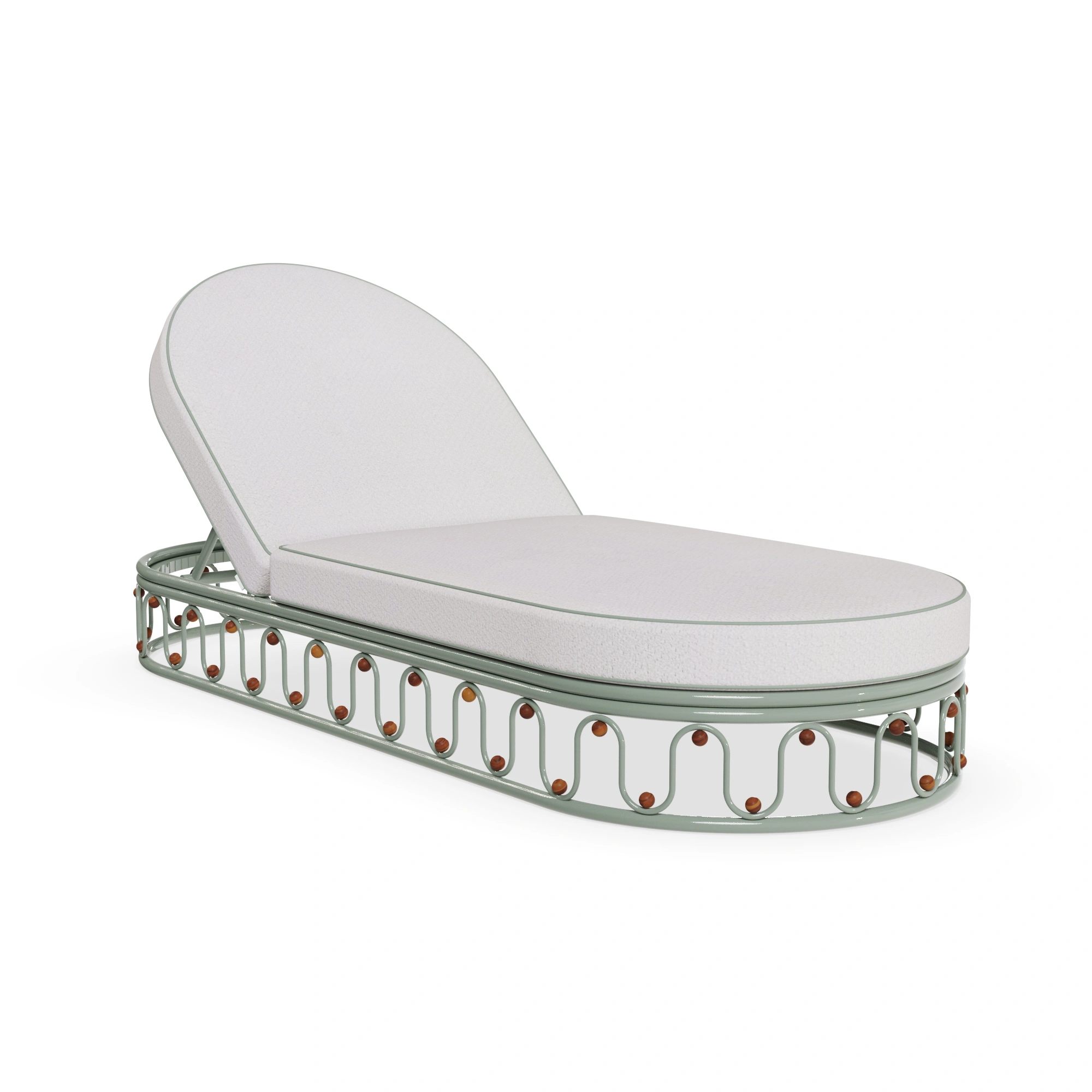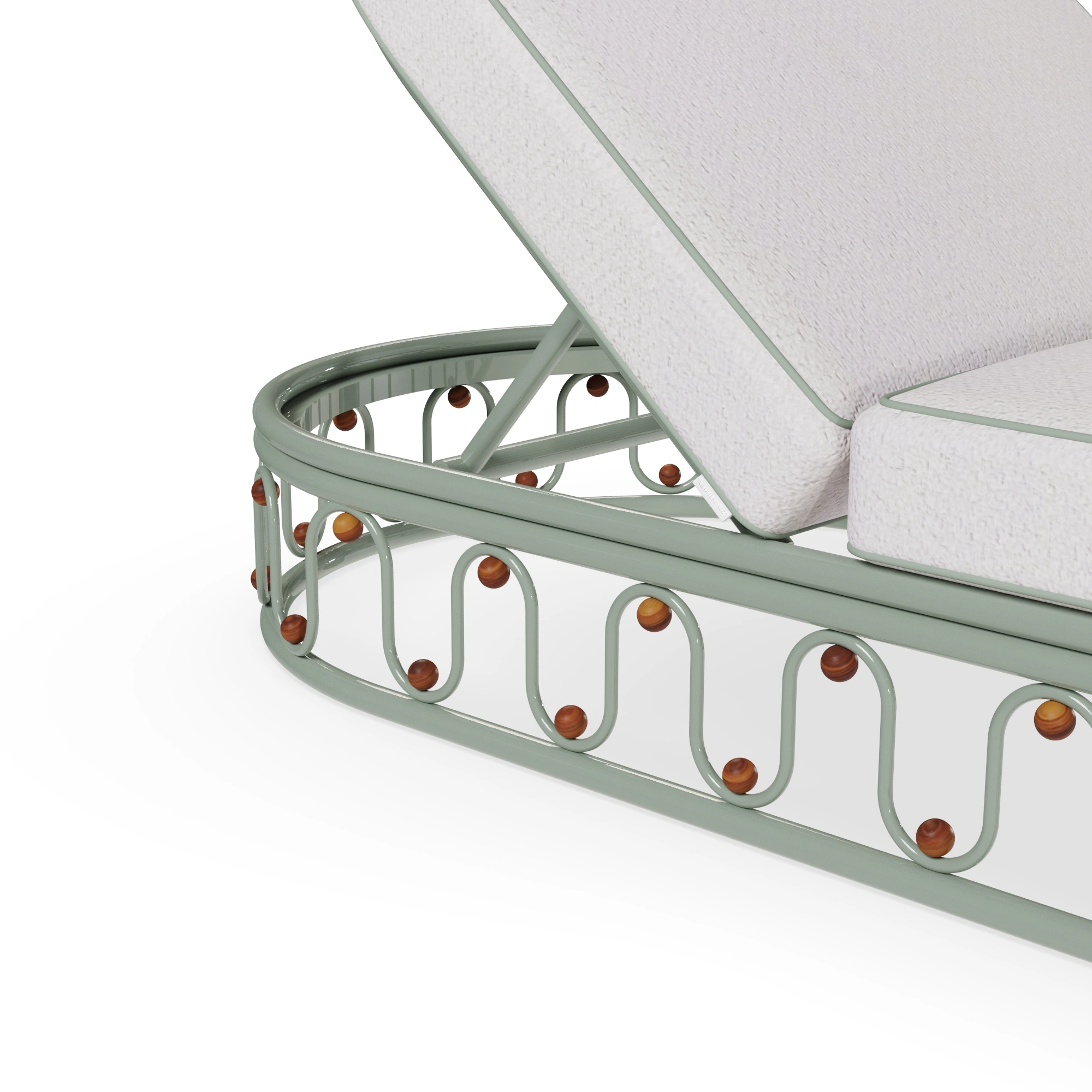 The Toulon Sunbed is a refined expression of luxury outdoor design, meticulously handcrafted in lacquered metal. Its sculptural base features elegant, wave-like curves adorned with Iroko wood decorative spheres, adding a warm natural accent that highlights the piece’s artisanal character. The soft, rounded silhouette of the upholstered seat invites relaxation, while the adjustable backrest ensures ultimate comfort for sunbathing or lounging. Balancing artistry and function, the Toulon Sunbed brings Mediterranean sophistication and timeless craftsmanship to any outdoor retreat.