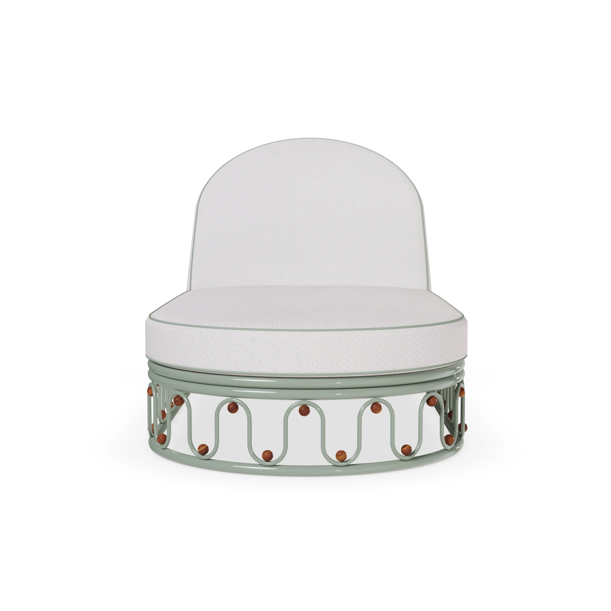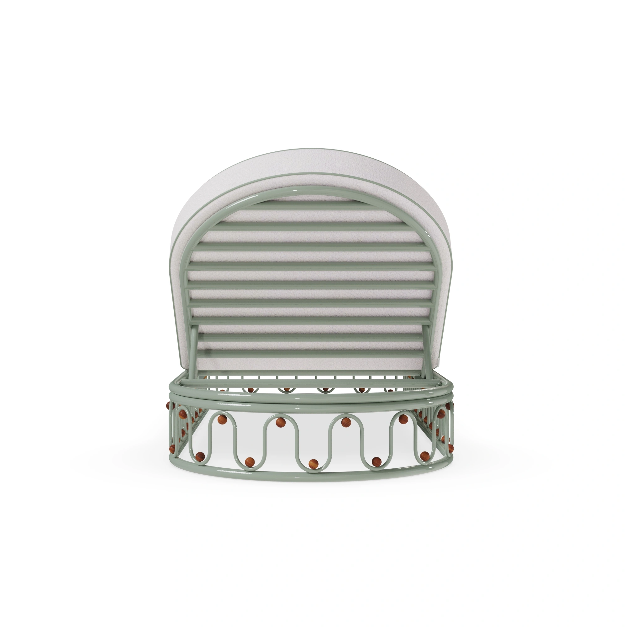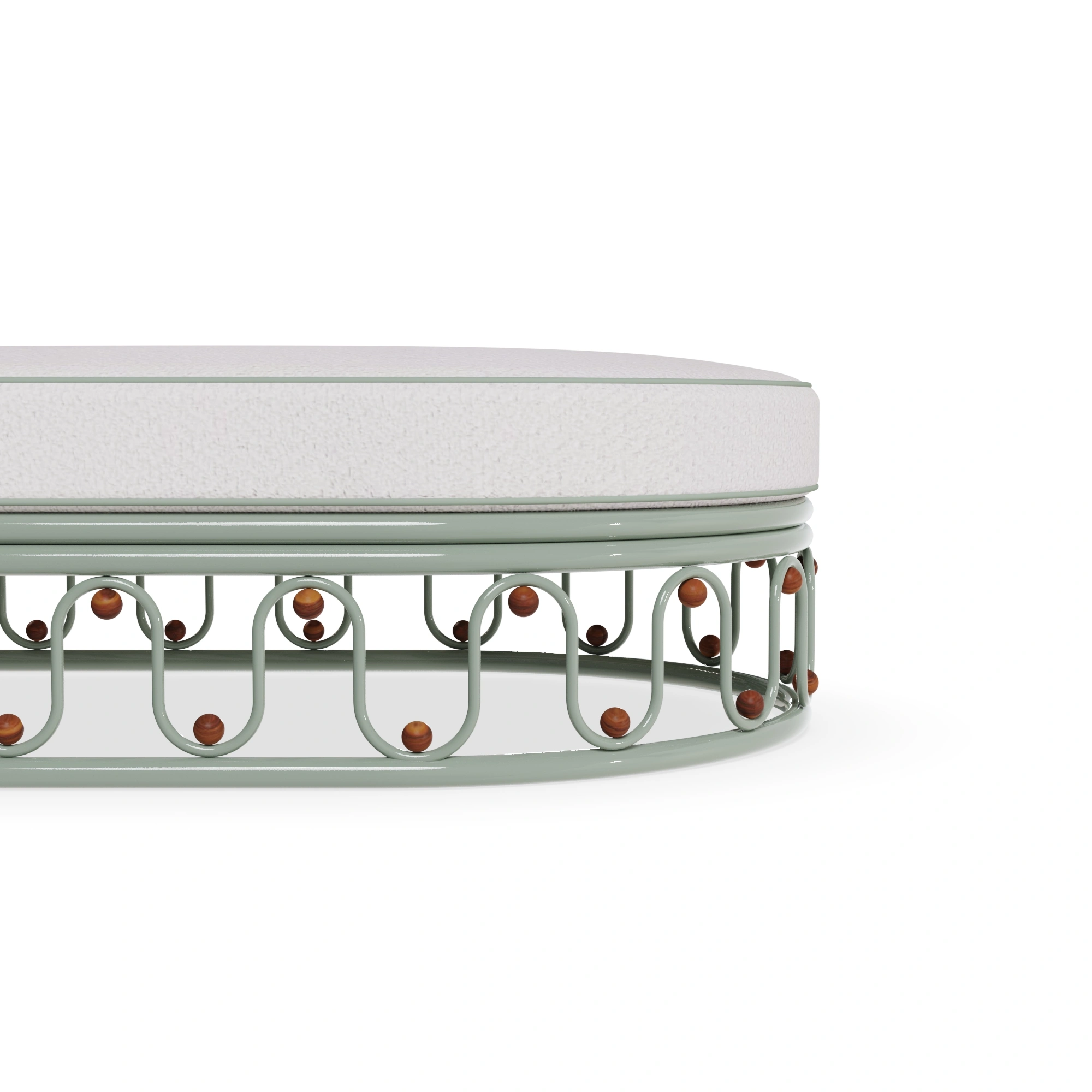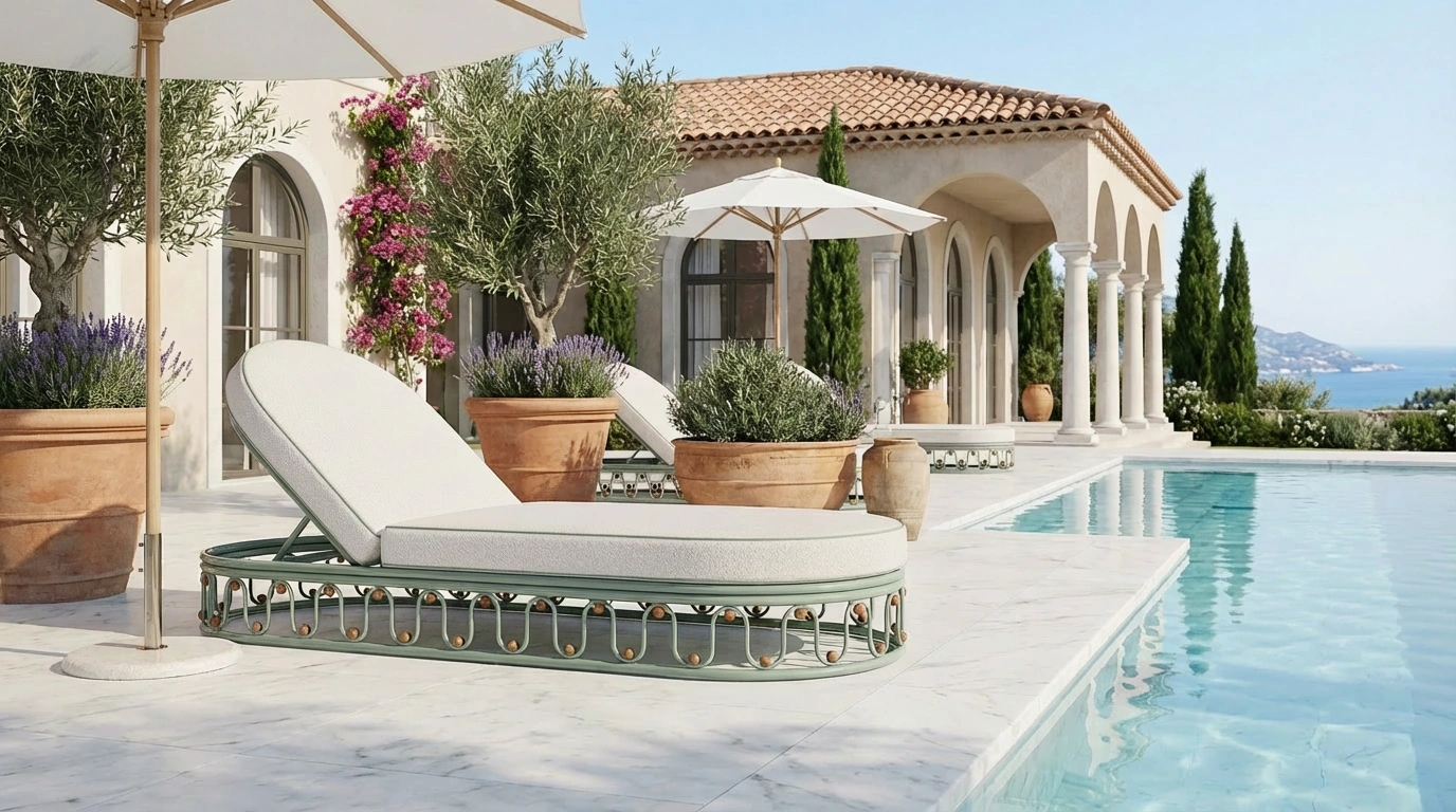 The Toulon Sunbed is a refined expression of luxury outdoor design, meticulously handcrafted in lacquered metal. Its sculptural base features elegant, wave-like curves adorned with Iroko wood decorative spheres, adding a warm natural accent that highlights the piece’s artisanal character. The soft, rounded silhouette of the upholstered seat invites relaxation, while the adjustable backrest ensures ultimate comfort for sunbathing or lounging. Balancing artistry and function, the Toulon Sunbed brings Mediterranean sophistication and timeless craftsmanship to any outdoor retreat.