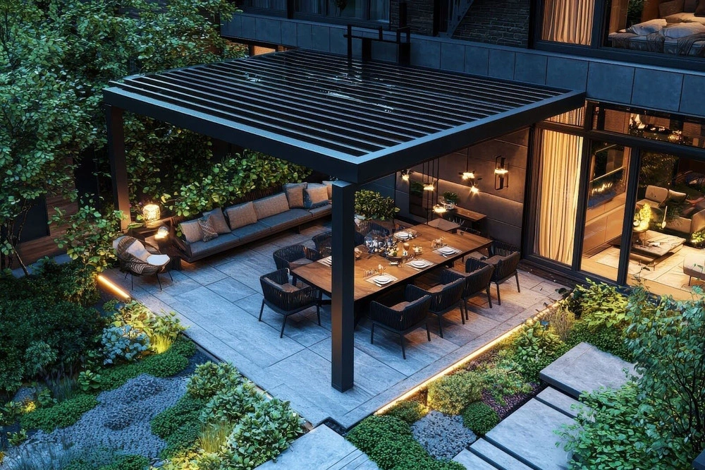 • Pergolas or retractable canopies for solar control